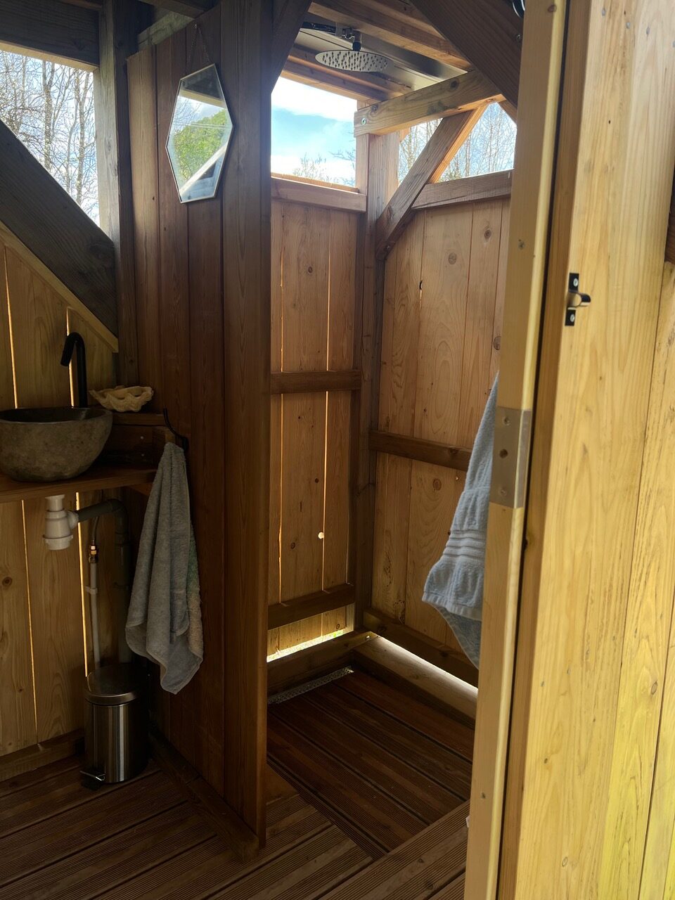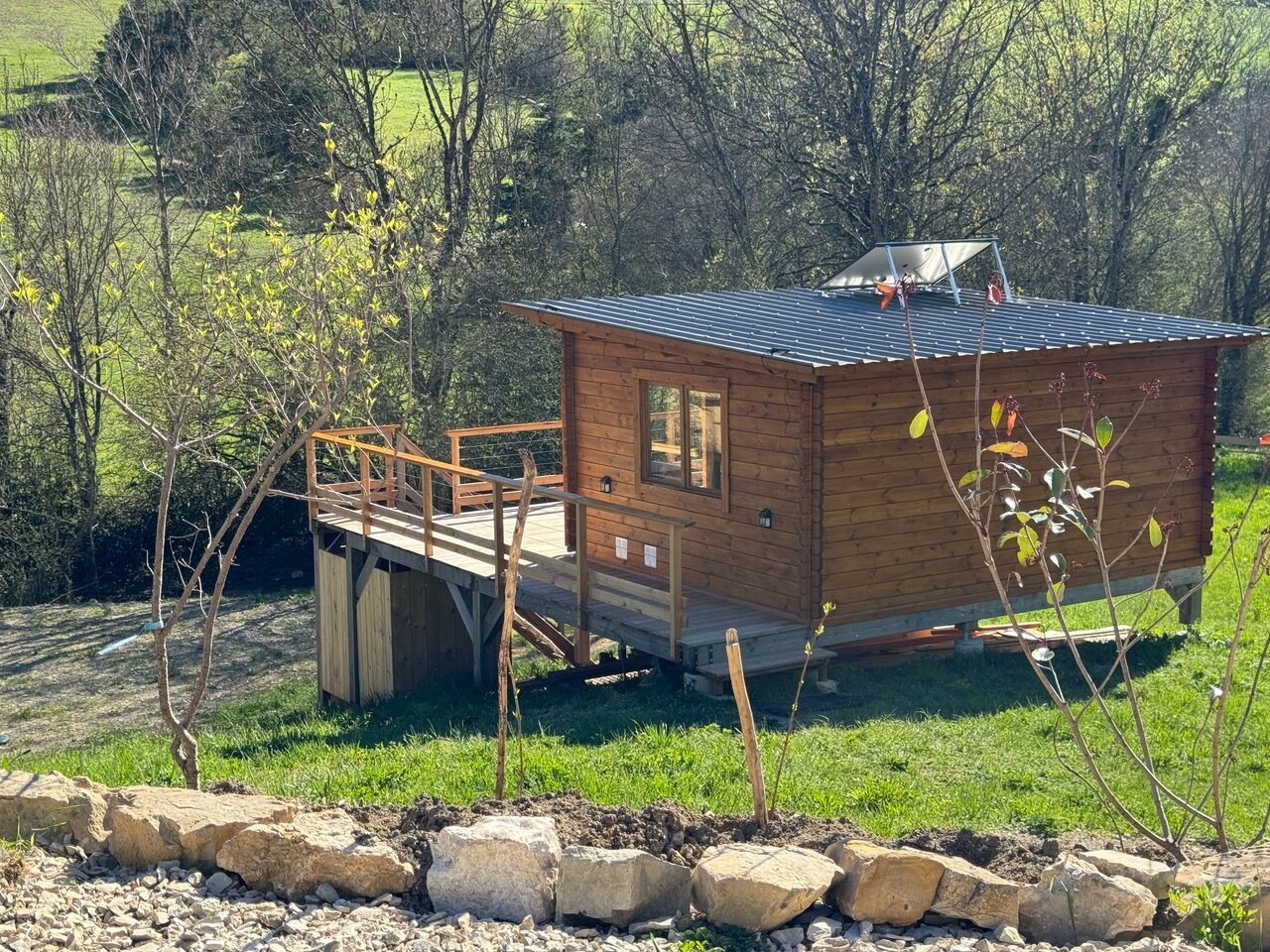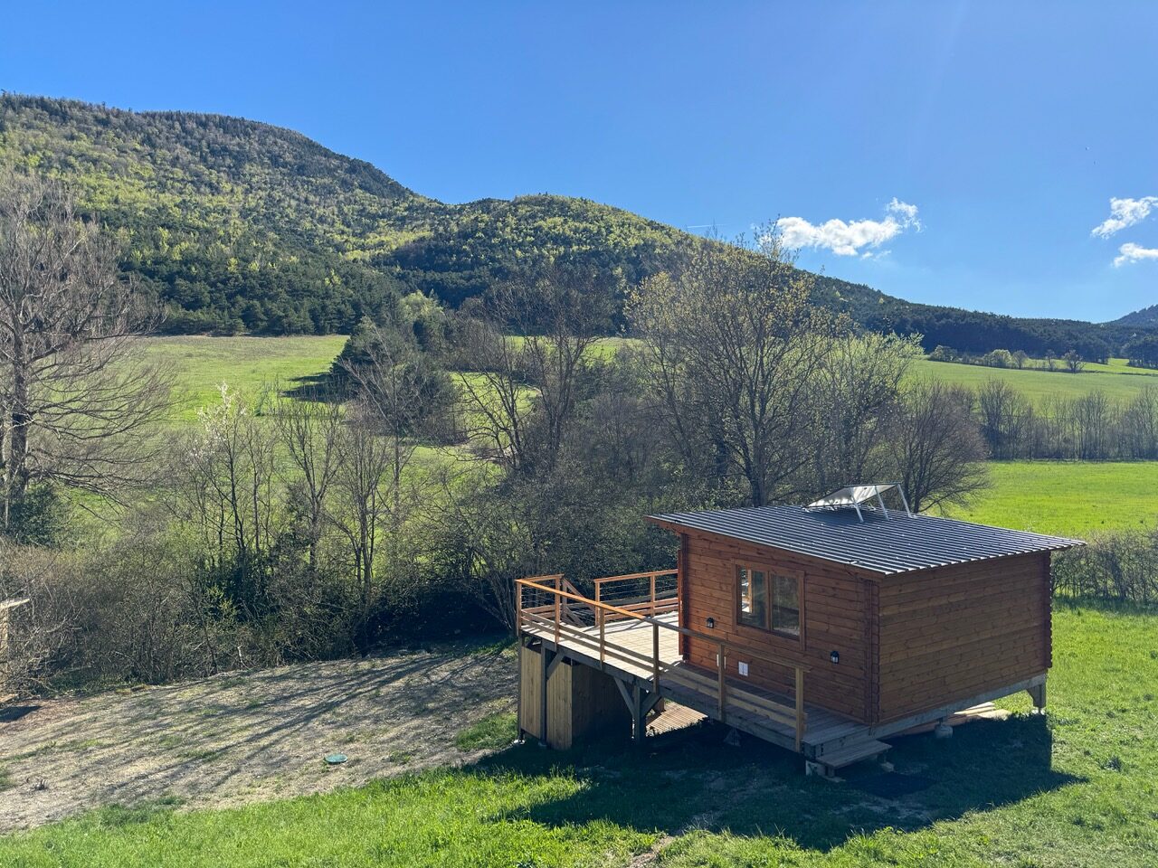 La Cabane Nature se compose d’une pièce de 19m2 avec un lit 2 places surélevé de 3 marches et 1 lit une place en dessous. Un coin salon et un coin cuisine vous permettent d’être autonome : frigo, évier et plaques de cuisson au gaz. Une grande terrasse de 25m2 surplombe le terrain au bord duquel coule une petite rivière de montagne. Sous la cabane se trouve la salle de bain avec un petit évier et une douche. La cabane est autonome en énergie solaire et en eau chaude solaire, et équipée de toilettes sèches extérieures.