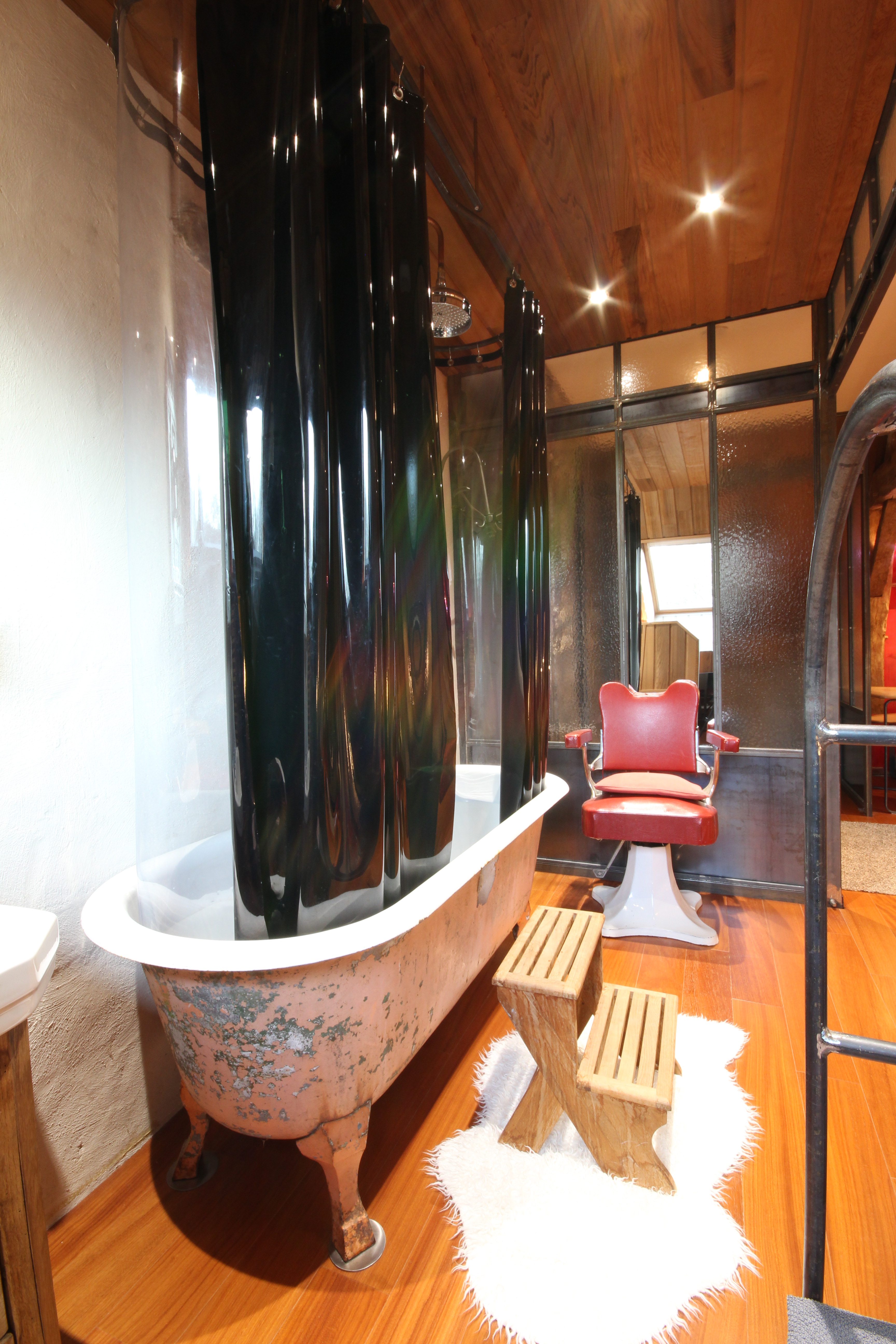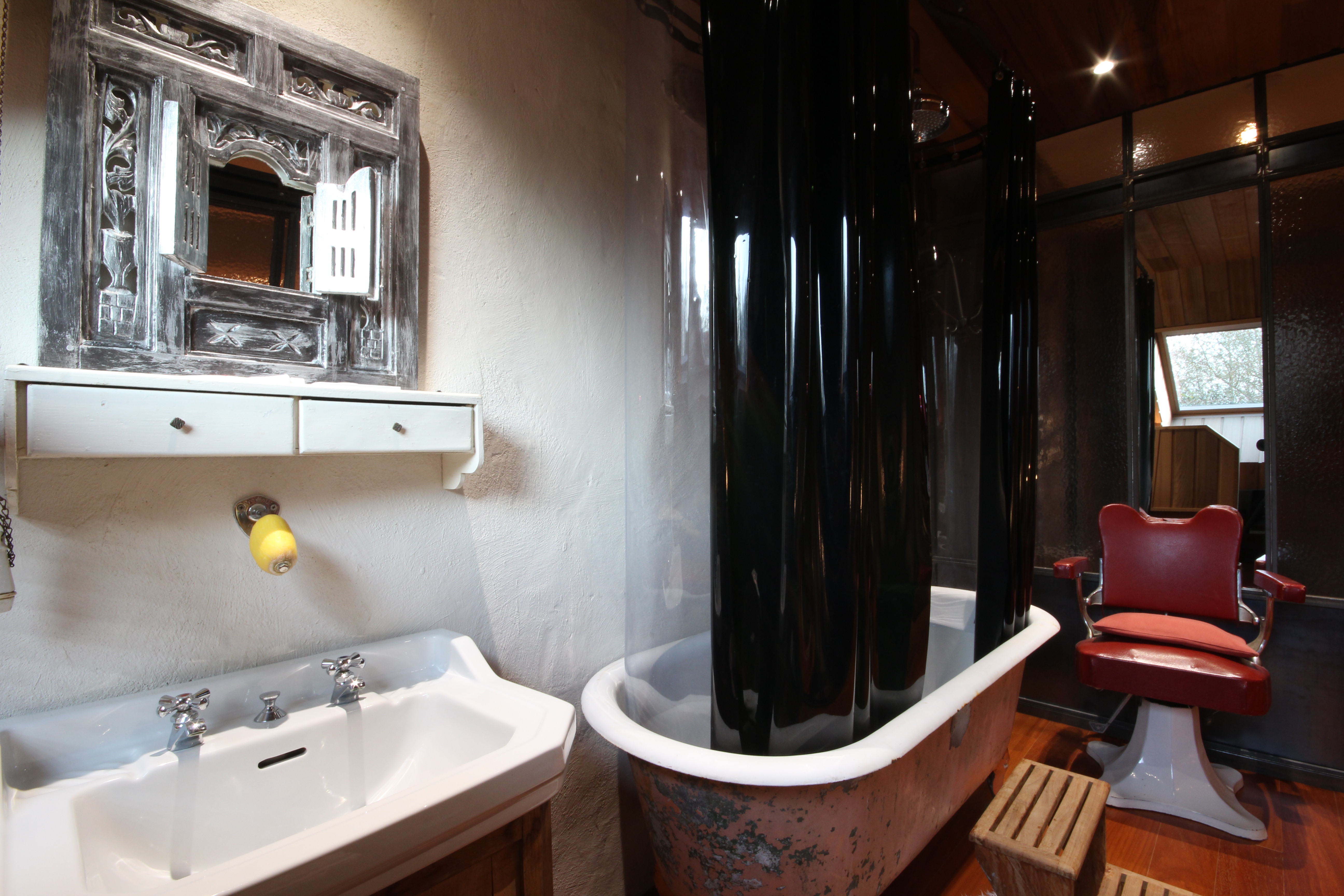 la chambre a été faite avec du mobilier ancien ;La douche est une ancienne baignoire rétro , revus et corrigée