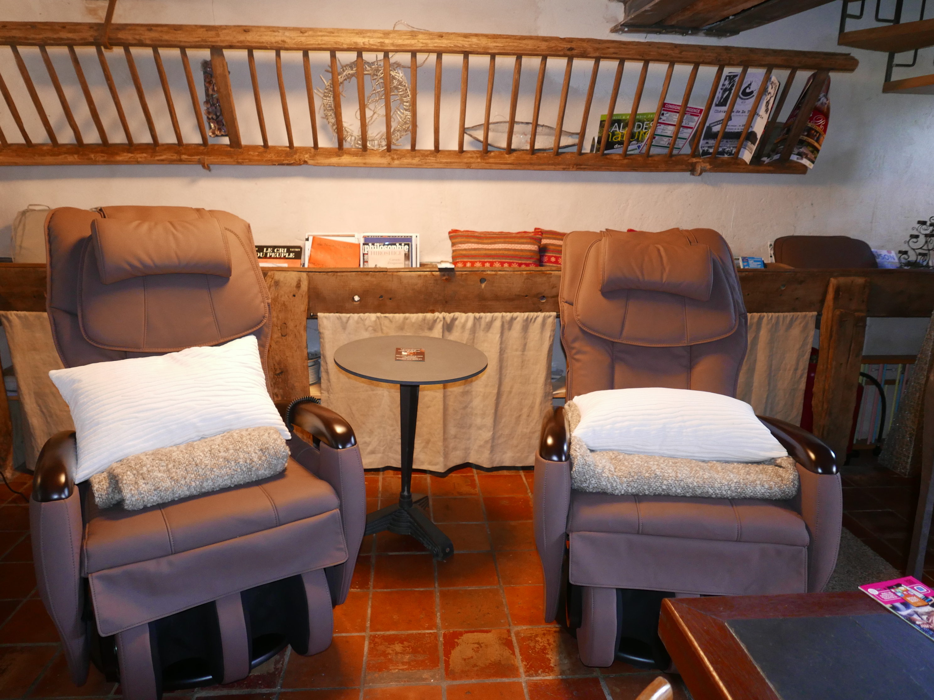 La chambre a son entrée privative , avec sa salle bien être : sauna et sièges massants ;Un jacuzzi extérieur se situe sur la terrasse au dessus de la rivière