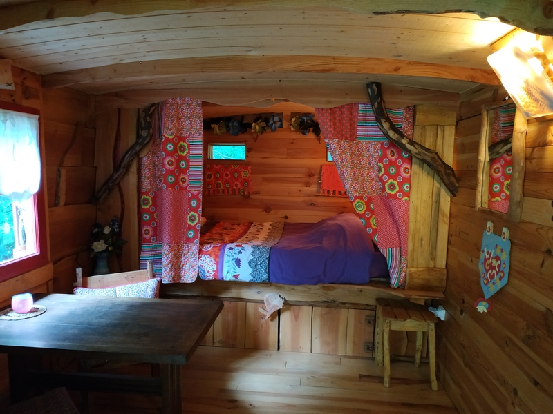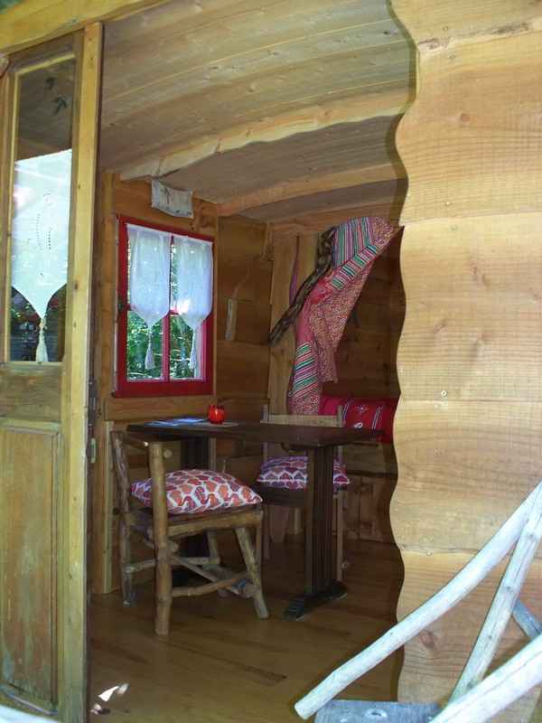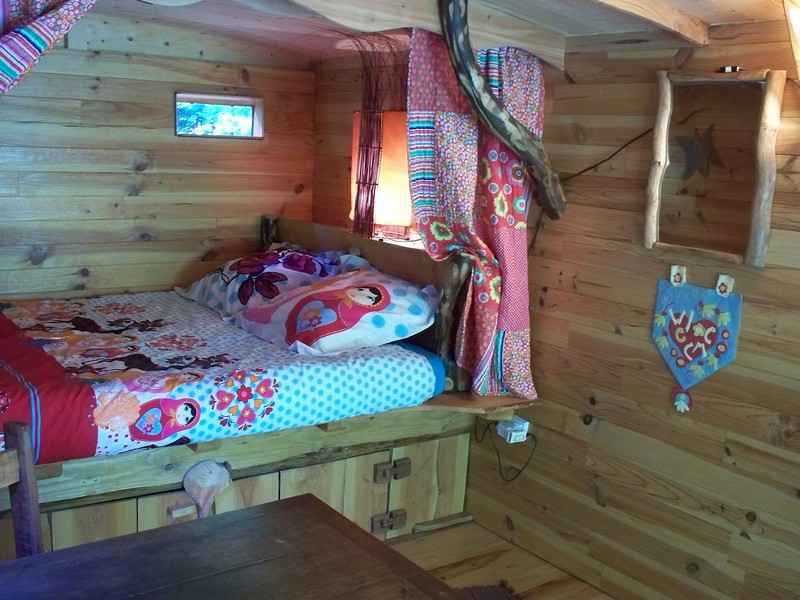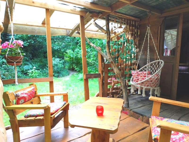 Cette jolie écocabane “bohème” est équipée d’un lit pour 2 pers. (140 cm) (couette, oreillers et linge de lit fournis, linge de toilette en option) et d’un coin repas, et d’une terrasse couverte.