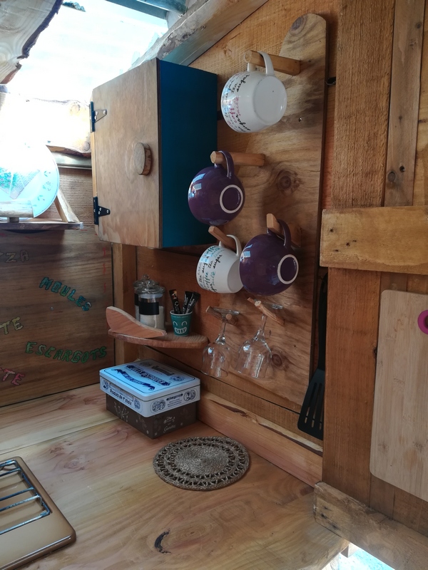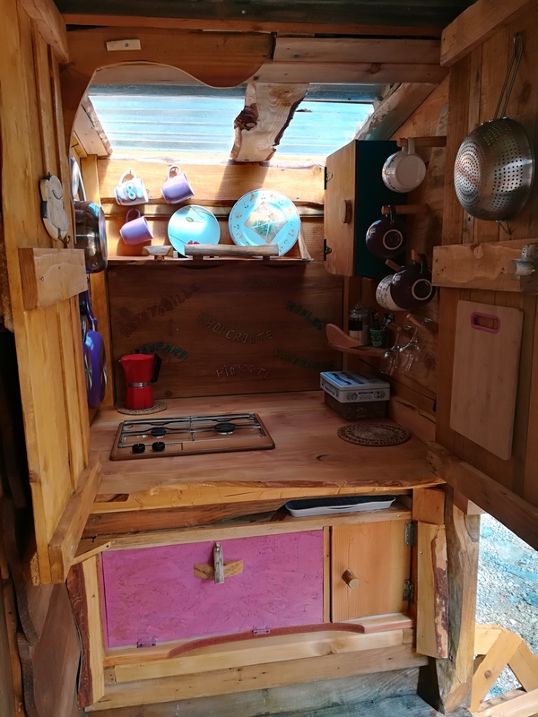 Tout à côté, la petite roulottine, équipée en mini cuisine (plaque gaz, mini frigo, petite réserve d’eau, vaisselle), vous permettra de préparer ou réchauffer vos repas.