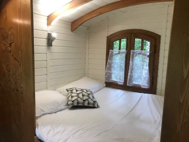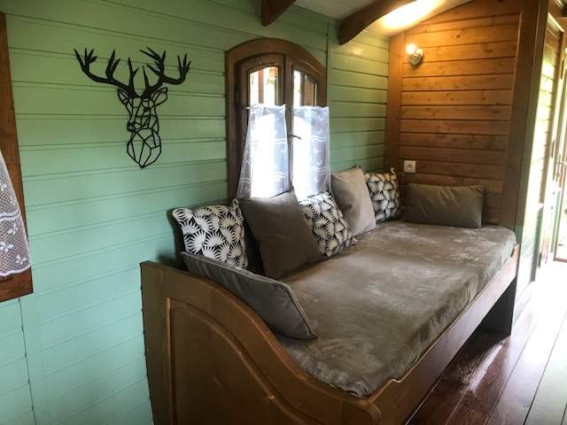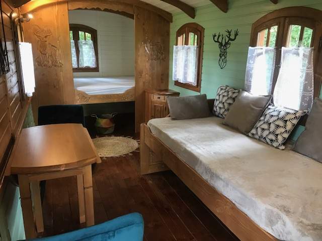 Cette magnifique roulotte Tzigane (15 m2) avec son jacuzzi privatif très coquette peut accueillir jusqu’ à 2/3 personnes :