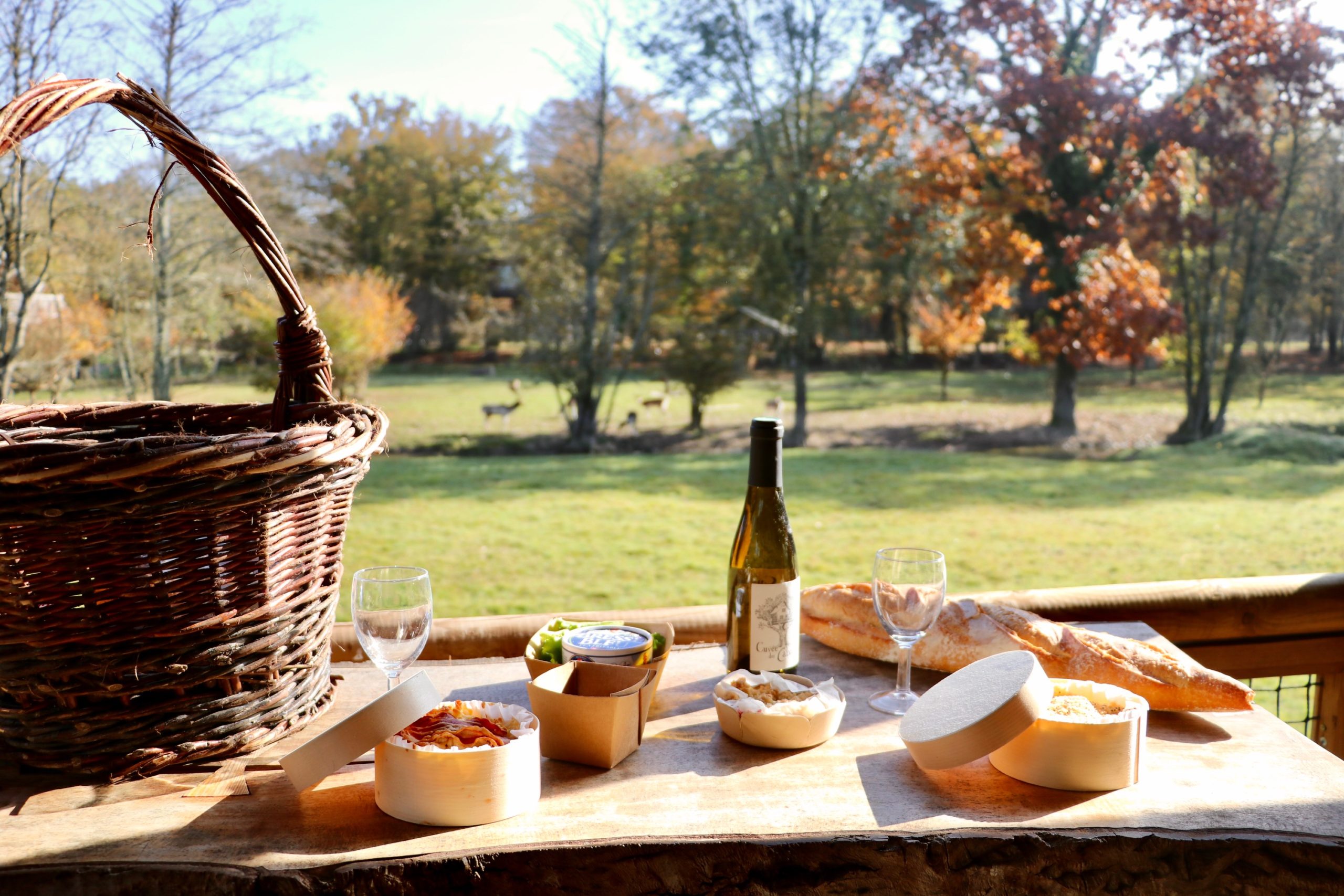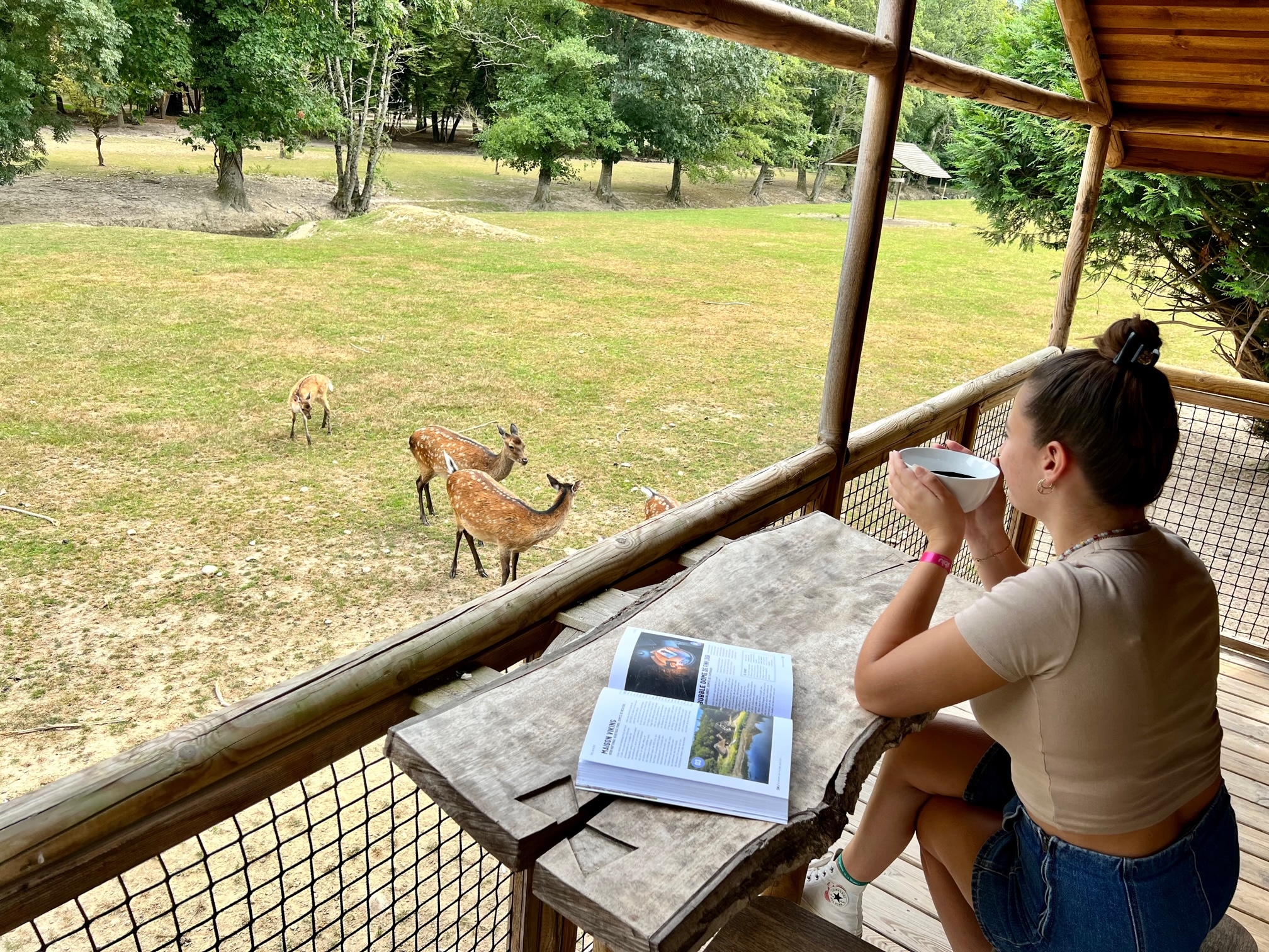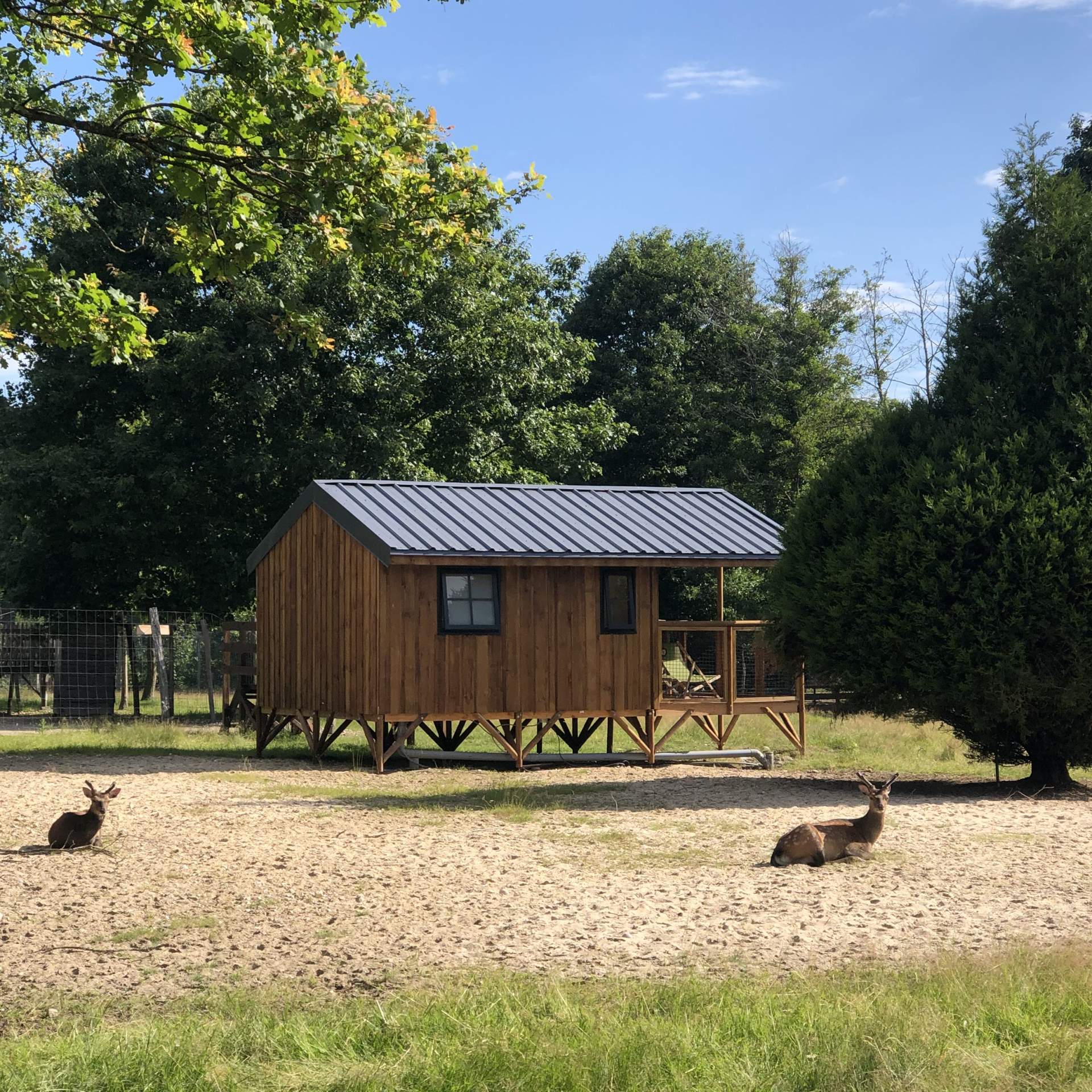 Une cabane duo en gamme luxe avec sa propre salle de bain et petite kitchenette. Complètement au milieu du parc des Cerfs et des Daims, surélevée sur pilotis, elle permet d’être véritablement au plus près des animaux. Splendide terrasse aménagée avec un mange debout et des transats, qui vous invitent à la détente absolue.