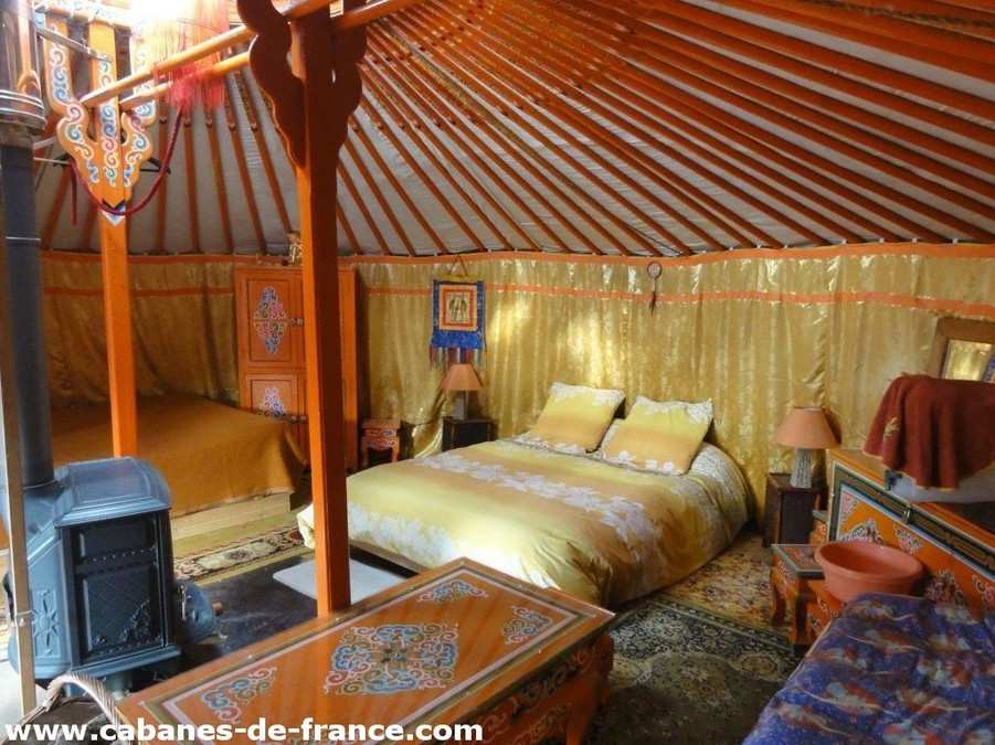 Une yourte dorée de 28 m2 avec 2 grands lits et un canapé-lit, des meubles traditionnels mongols (table basse, tabourets, plusieurs armoires), des tapis, des toilettes sèches et un rince doigts.
