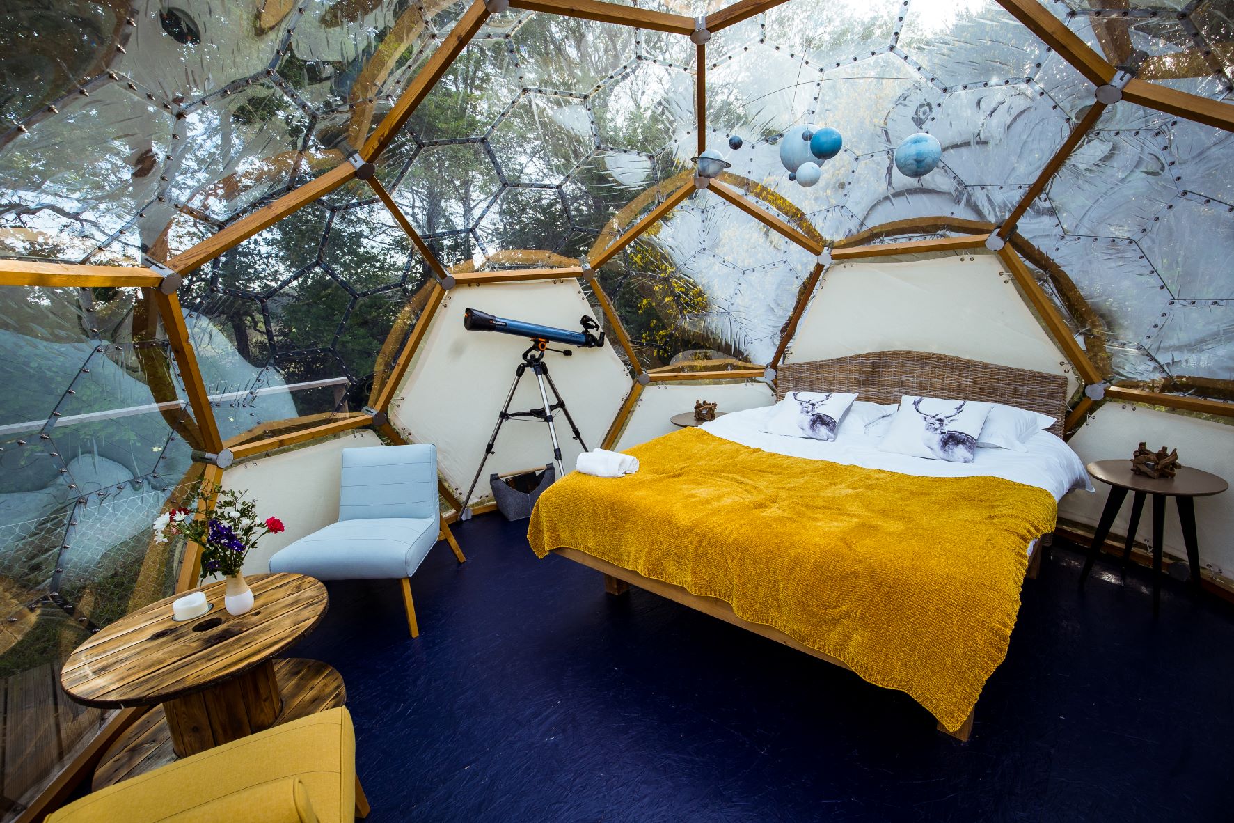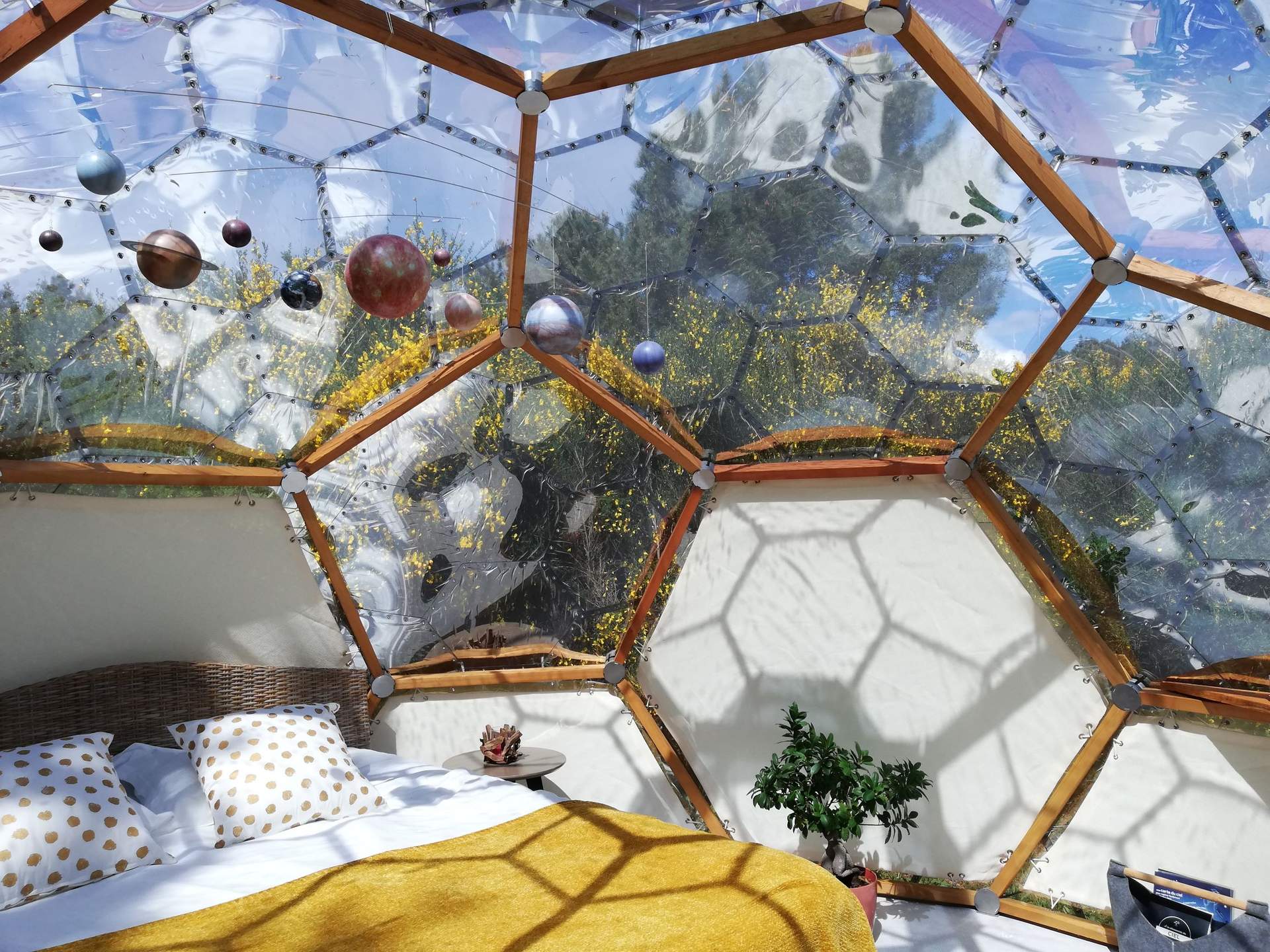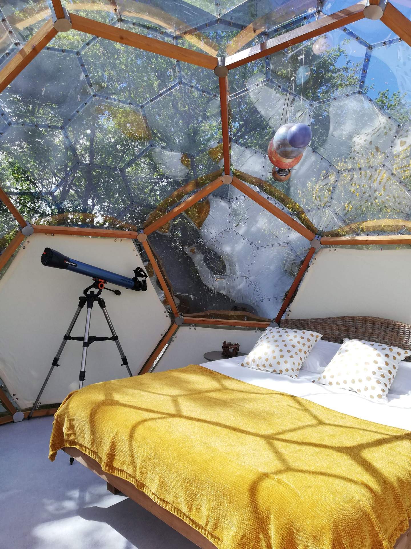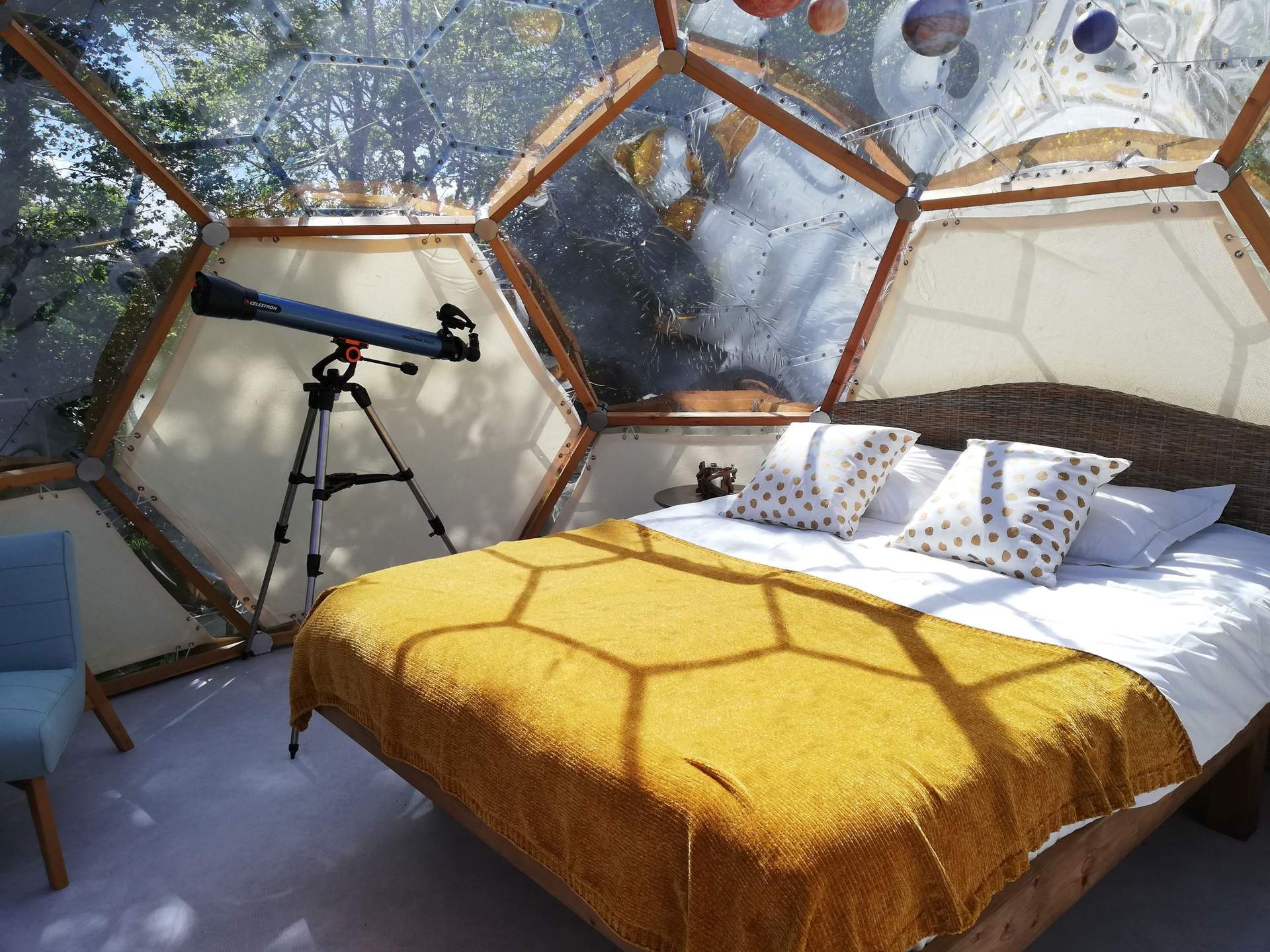 L’Astrolabe est équipé d’un lit double ( 160×200), d’un coin salon et d’une grande terrasse avec salon de jardin et transats. Vous pourrez déguster votre petit déjeuner sous le dôme ou sur la terrasse.