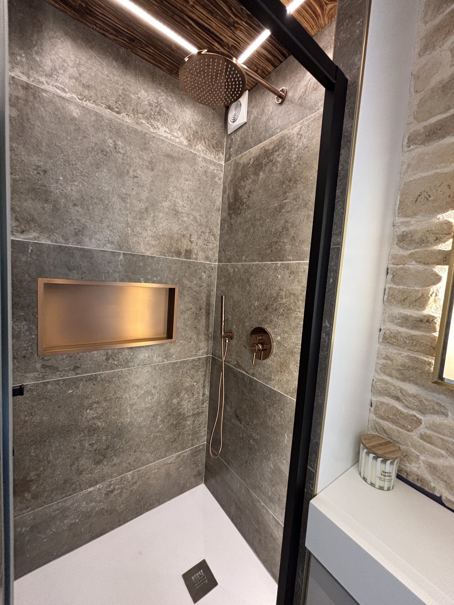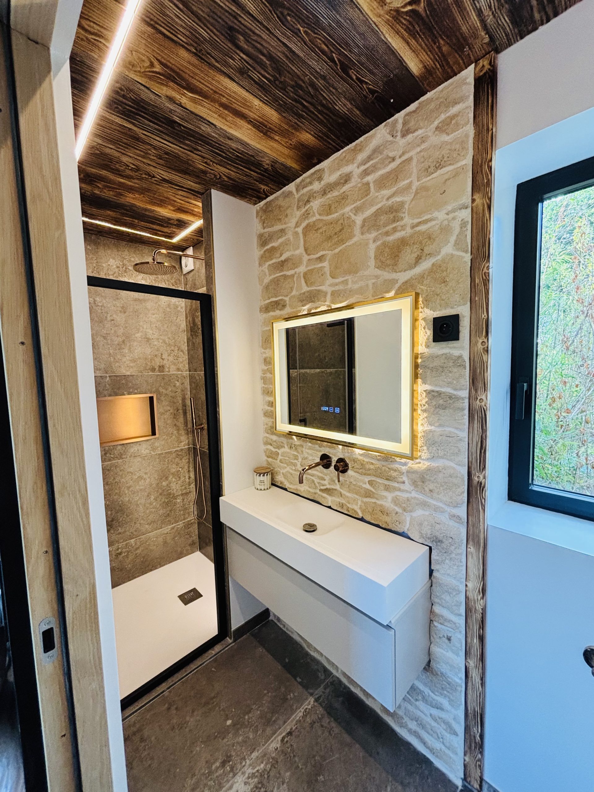 Pièces baignées de lumière, décorées avec des matériaux nobles alliant le bois et la pierre, pour une ambiance chaleureuse et contemporaine.