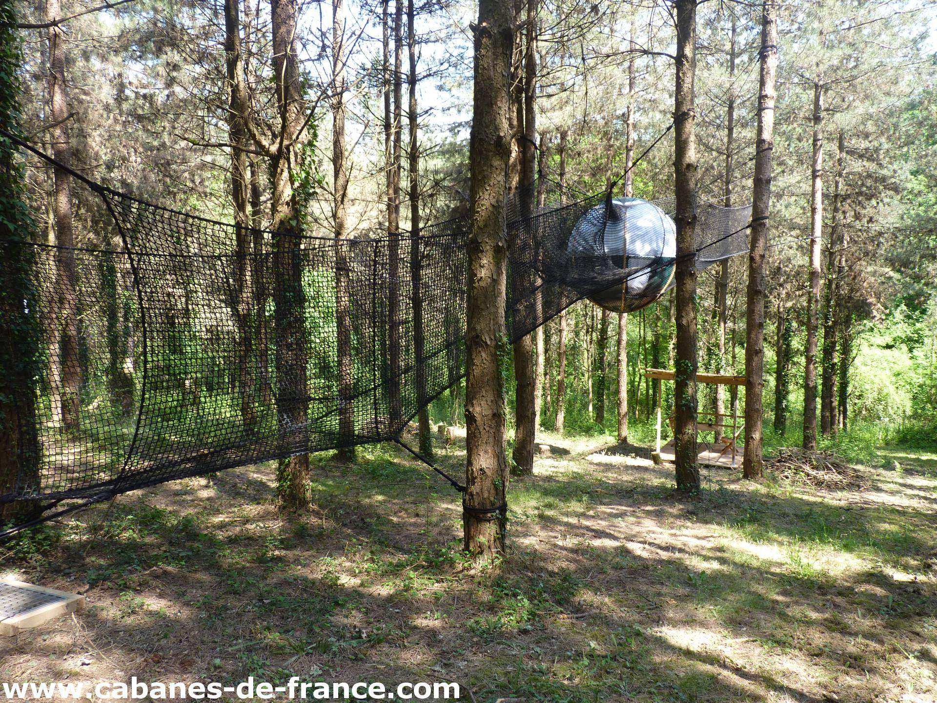 Accrochés à 6m de hauteur, on accède facilement au Nid au moyen de filets tendus entre les pins depuis le sol. Chaque nid peut accueillir 2 personnes, ou même un couple avec un enfant de trois à dix ans.( Pour les enfants en bas-âge ou pour deux enfants contactez-nous pour un accord préalable). Recouvert de toile de  taud de marine doublée, chaque Nid, de 3m de diamètre, est équipé d’un matelas de grande qualité et d’une couette sur mesure, pour un confort exceptionnel. Au matin, les oiseaux tout proches vous réveilleront. Ouvrez la toile du Nid et admirez la forêt de pins et toute sa faune. Autour de chaque nid un hamac géant de plus de 20 m2 vous permet d’évoluer en toute sécurité, vous n’aurez plus envie de descendre!