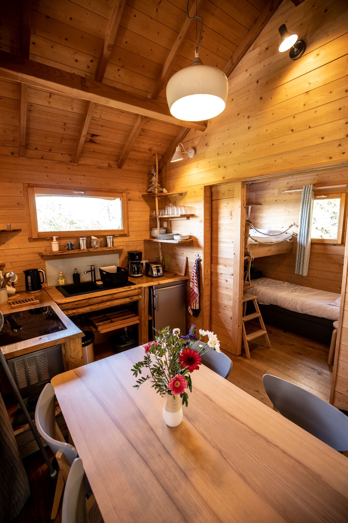 Se retrouver … en couple, entre amis ou en famille le Nordic lodge peut accueillir jusqu’à 5 personnes. C’est une cabane tout confort ( salle d’eau, cuisine, chauffage électrique …) avec une terrasse panoramique. Elle invite petit et grand à vivre une aventure unique. Le Nordic Lodge peut accueillir les personnes à mobilité réduite. On y accède facilement par une passerelle reliée à notre kota accueil. La cabane est équipée de deux chambres, une avec un lit deux personnes et la seconde avec trois lits une personne.