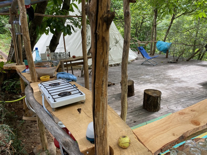 Il est monté sur une grande terrasse en bois de 100m2, ombragée, surplombant la forêt et la rivière. Une cuisine extérieure abritée, rustique mais bien équipée, alimentée en gaz et en eau de la source, vous permet une autonomie de vie. Livre d’or et bon petits plans pour découvrir la gastronomie des petites montagnes ardéchoises et cévenoles, empreinte de naturel comme de bon goûts !