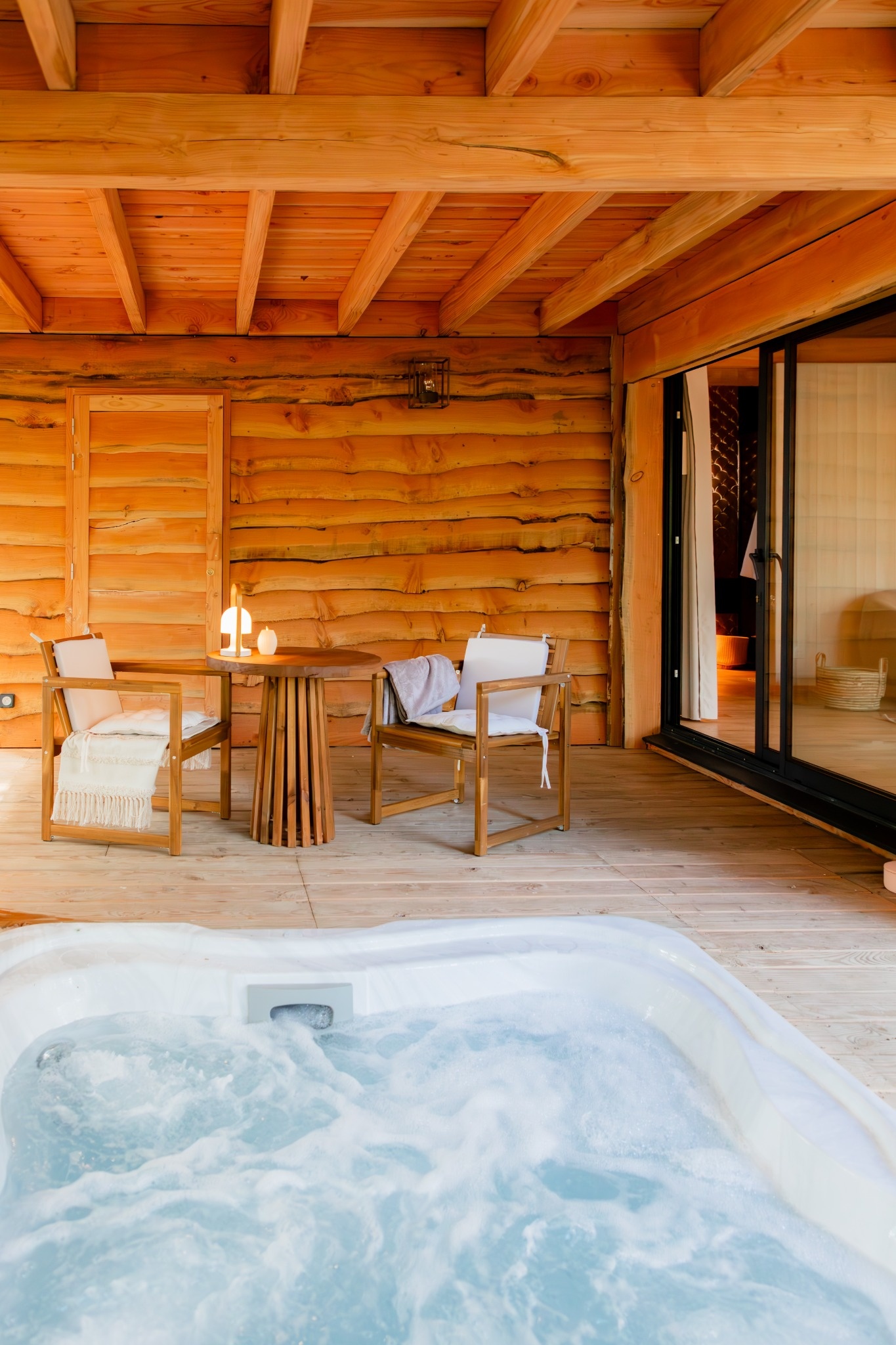 Brunch et départ tardif : Le brunch est livré à 10h et vous profitez de votre cabane jusqu’ à 13h. Il est composé de copieuses viennoiseries, pains, confitures, jus de fruits, jambons, fromages, yaourts, fruits frais, œufs et muesli. 30€ personne.