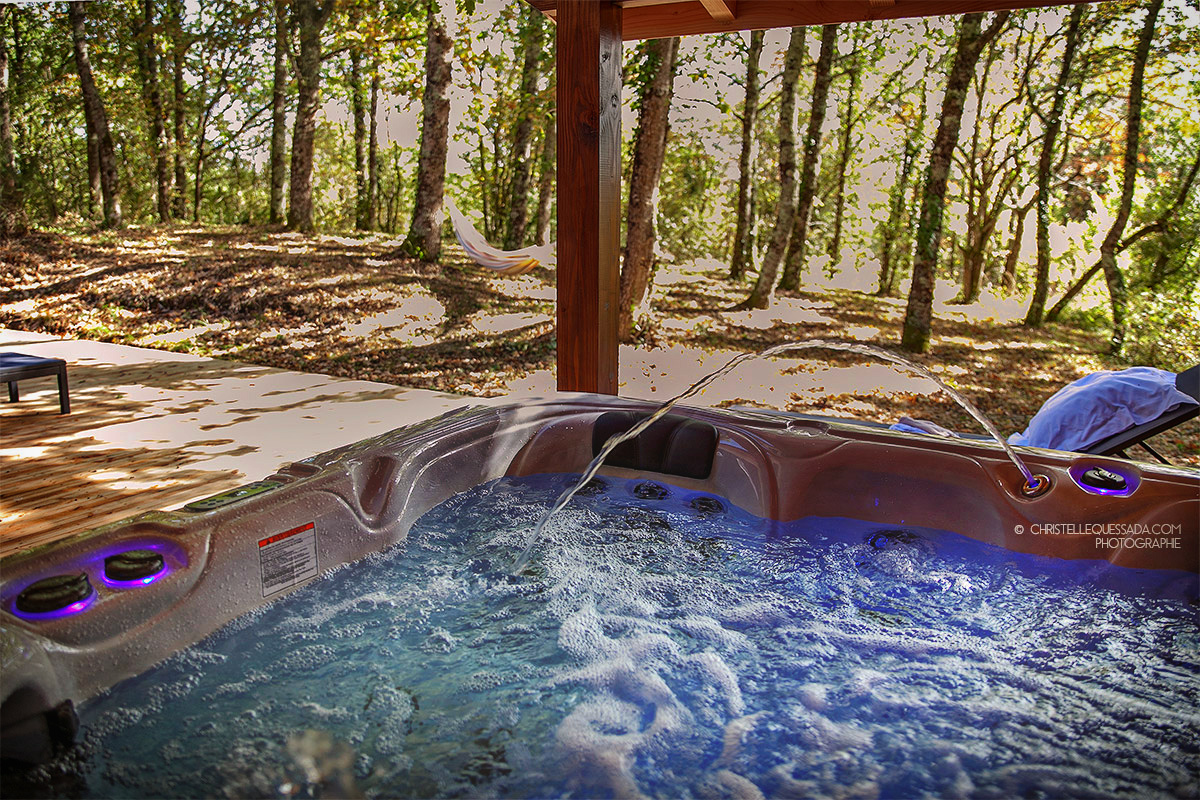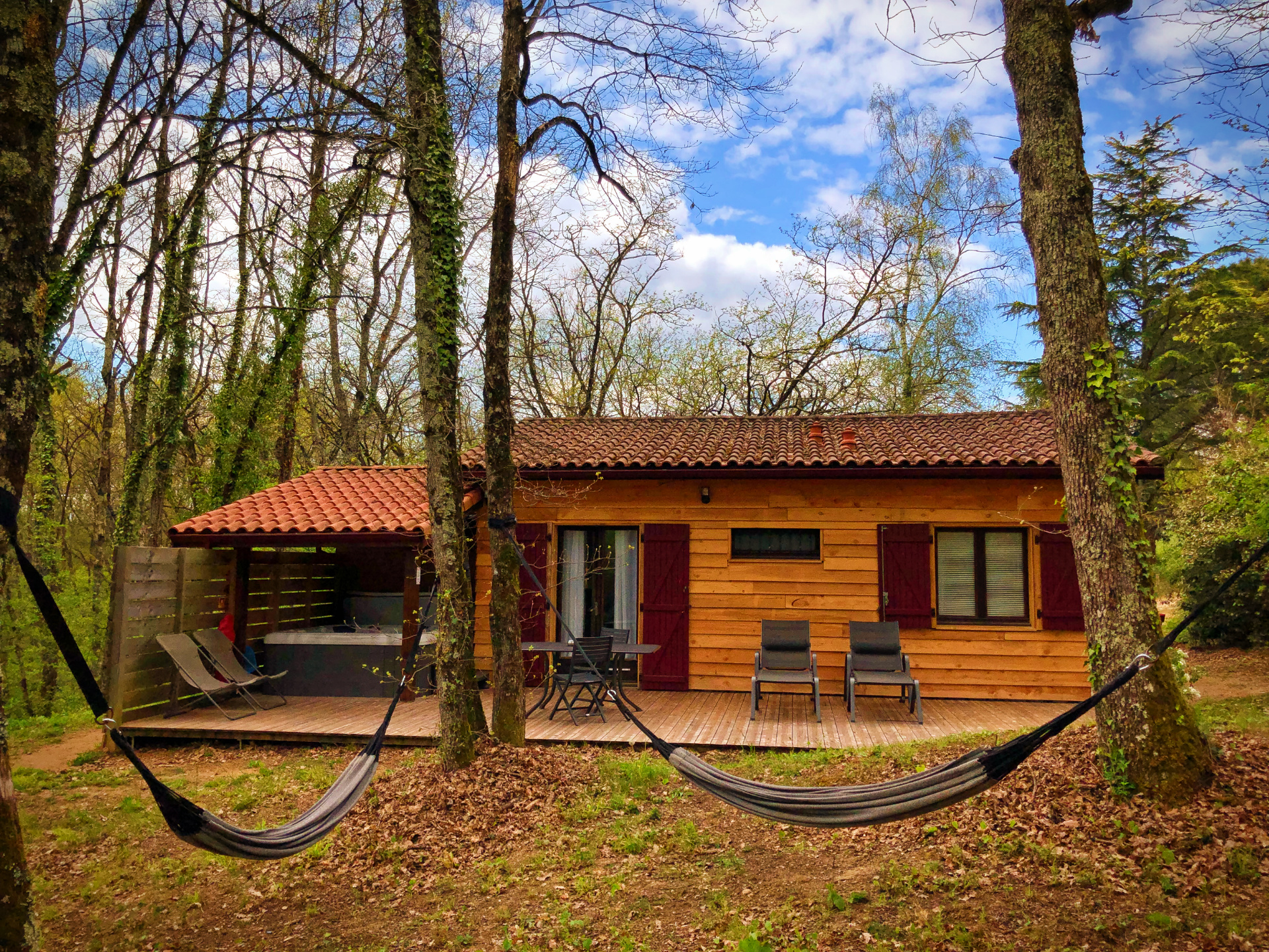 Cabanes perchées, chalets et lodges, avec spa privatifs, dans une forêt su Quercy au calme parfait.