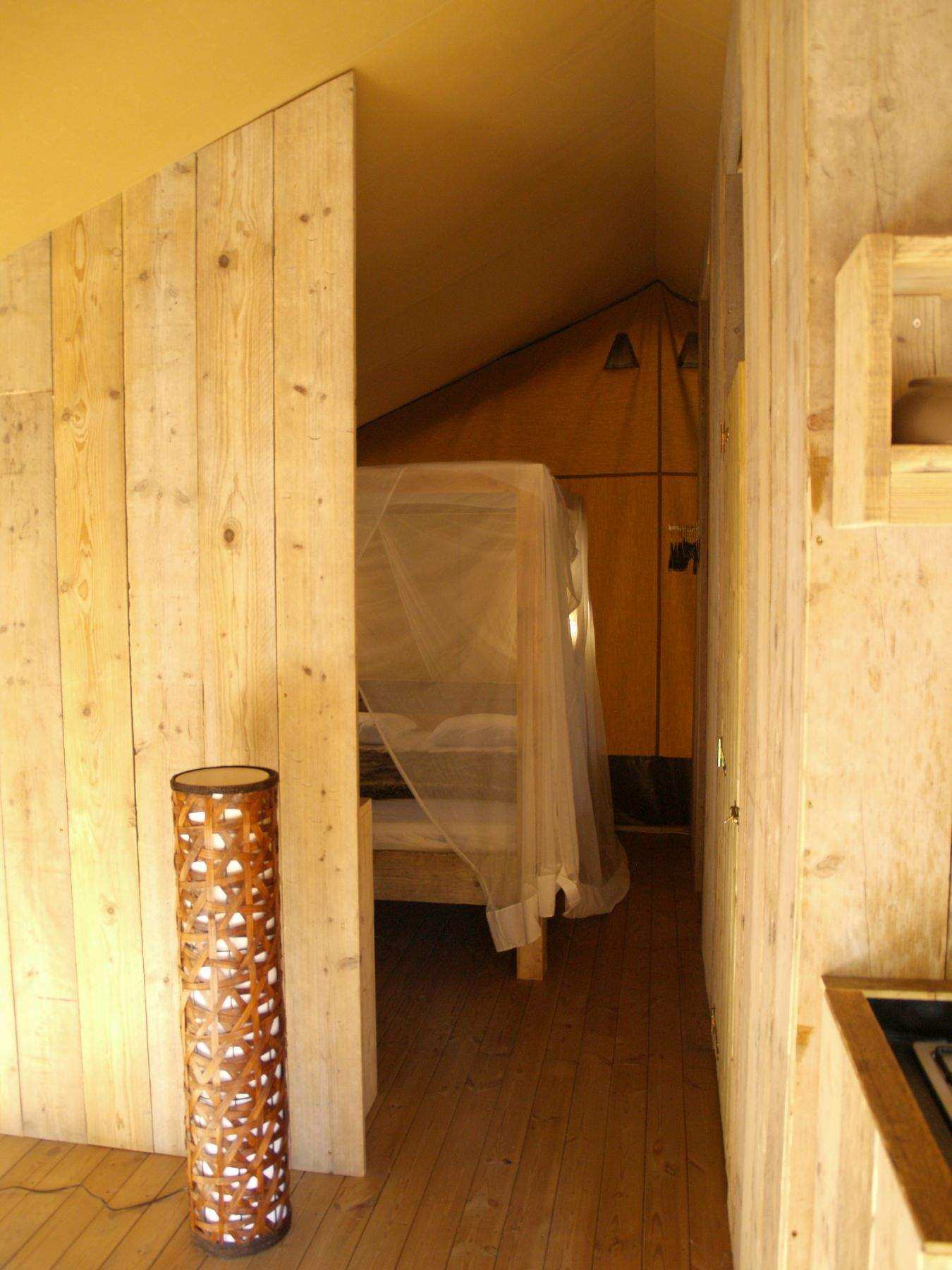 Elles sont équipées pour 5 personnes. Vous disposez de 2 chambres, avec cloisons en bois et rideau. Une chambre avec un grand lit double (160 x 200cm) et une chambre avec 1 lit superposé et un lit simple. Nous disposons aussi d’une Lodge Safari avec 5 couchages (1 lit superposé, 1 lit simple et un lit double). Couettes et oreillers. (Nous ne fournissons pas les draps mais ils peuvent être loués sur place).