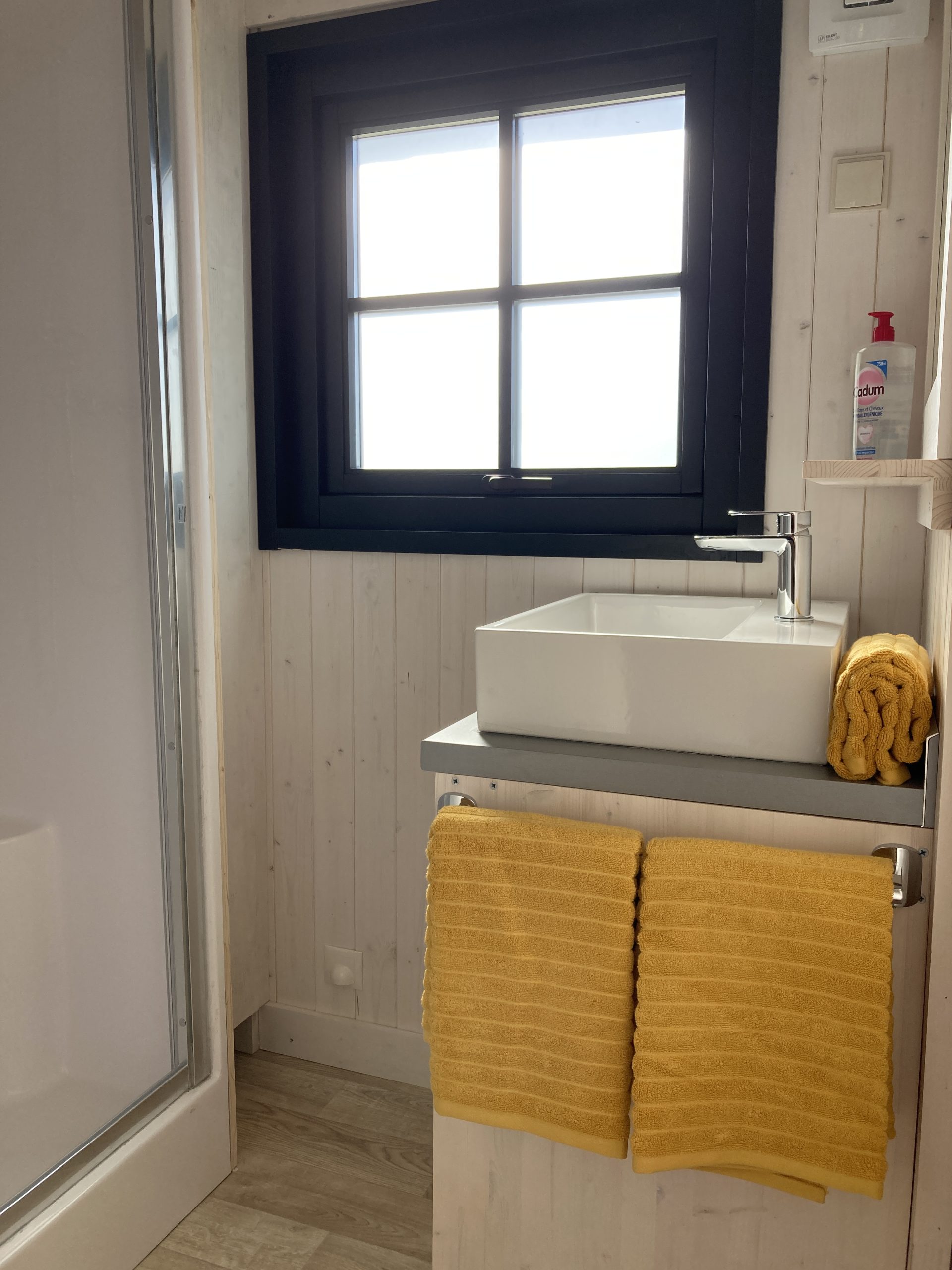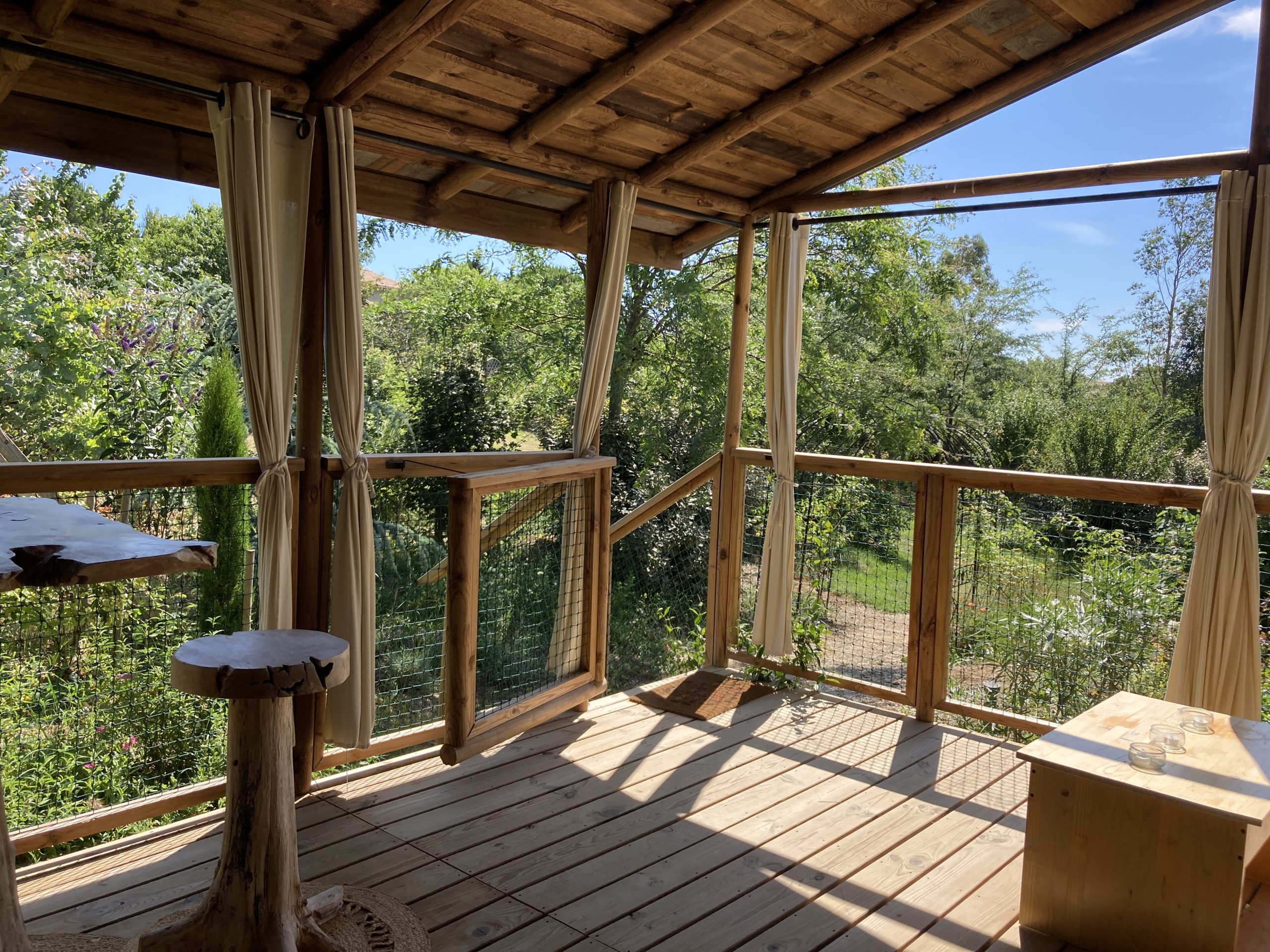 Cette cabane très romantique est équipée d’une kitchenette, d’une salle d’eau et d’un WC séparé.  Son point fort est la grande terrasse couverte, ses garde-corps et son mobilier artisanal en bois.