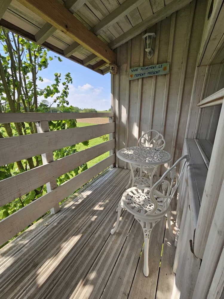 De votre lit, la vue donne sur la plaine de Picardie où le paysage et les couleurs évoluent en fonction du travail des champs. Une jolie terrasse donne le soir sur le couché de soleil où il est bon de déguster un panier repas. Le matin, vous apercevrez pour les plus chanceux, le gibier qui se promène au loin. Pensez à apporter vos jumelles !