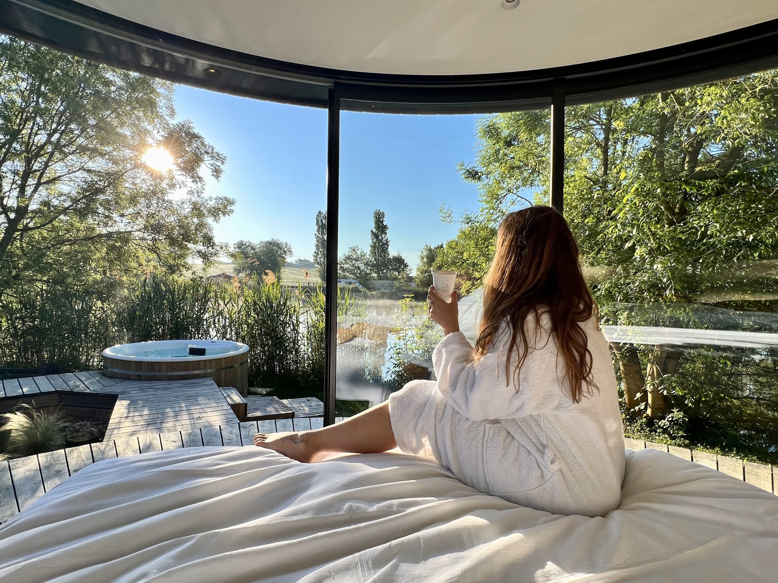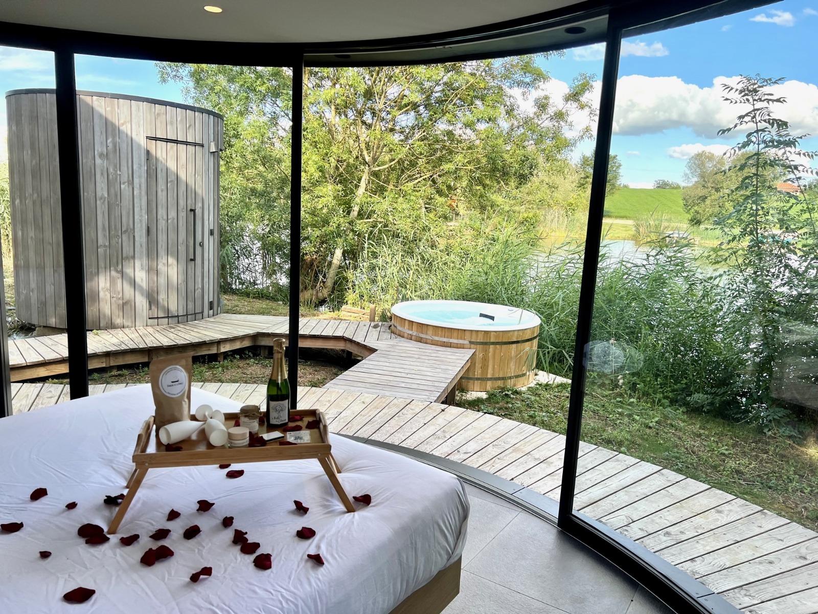 D’un simple geste les vitres courbées et réversibles de la cabane s’ouvre entièrement et la frontière dedans/dehors s’efface pour laisser place à une expérience inédite. On vous garantit offrir une reconnexion totale avec la nature et en prime une vue imprenable sur tout l’étang.