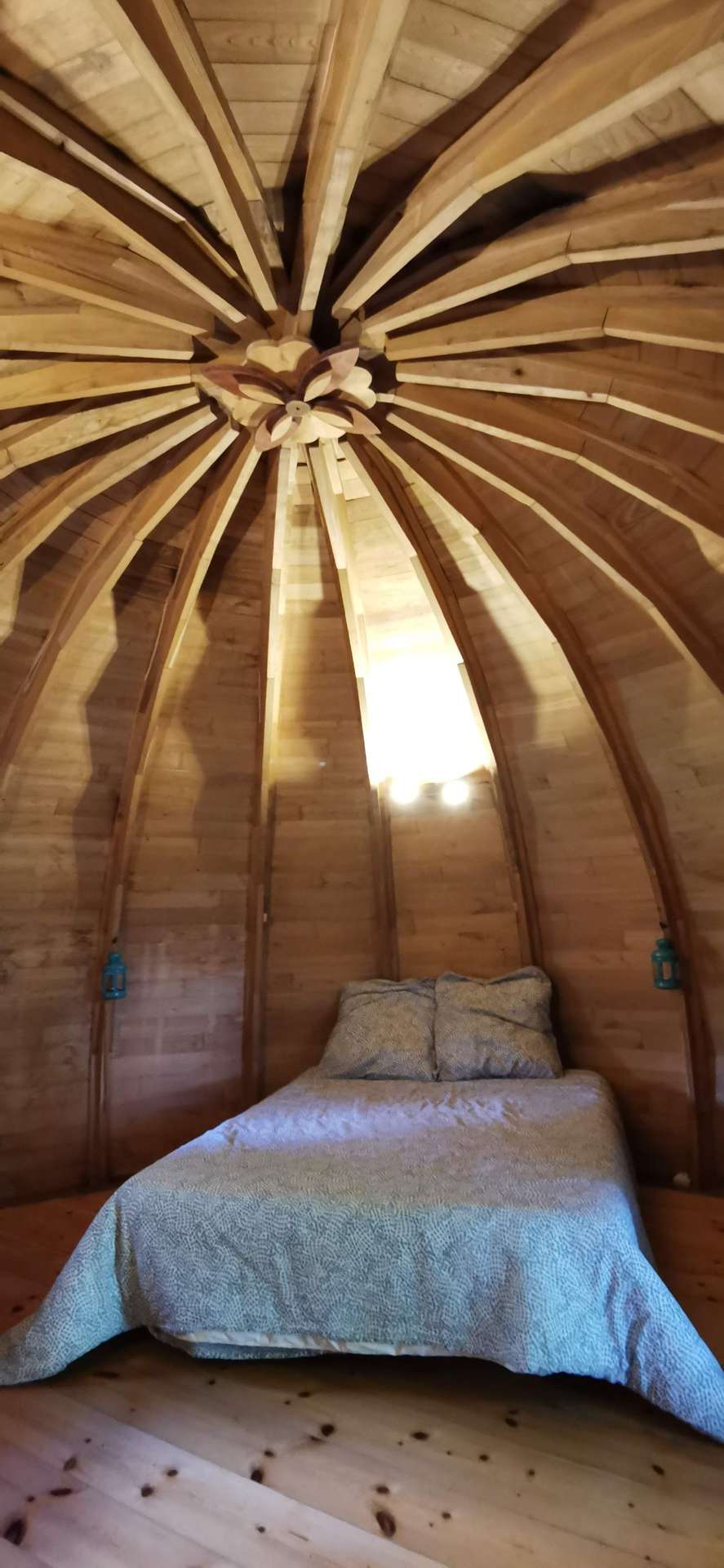 “Le Nid’gloo” est un dôme de 16m² entièrement bardé de bois, tapi sous les arbres au dessus d’un des étangs, où vous prélasser, et observer discrètement depuis la terrasse les grenouilles, écureuils, hérons, chouette, canards, et autres voisins …