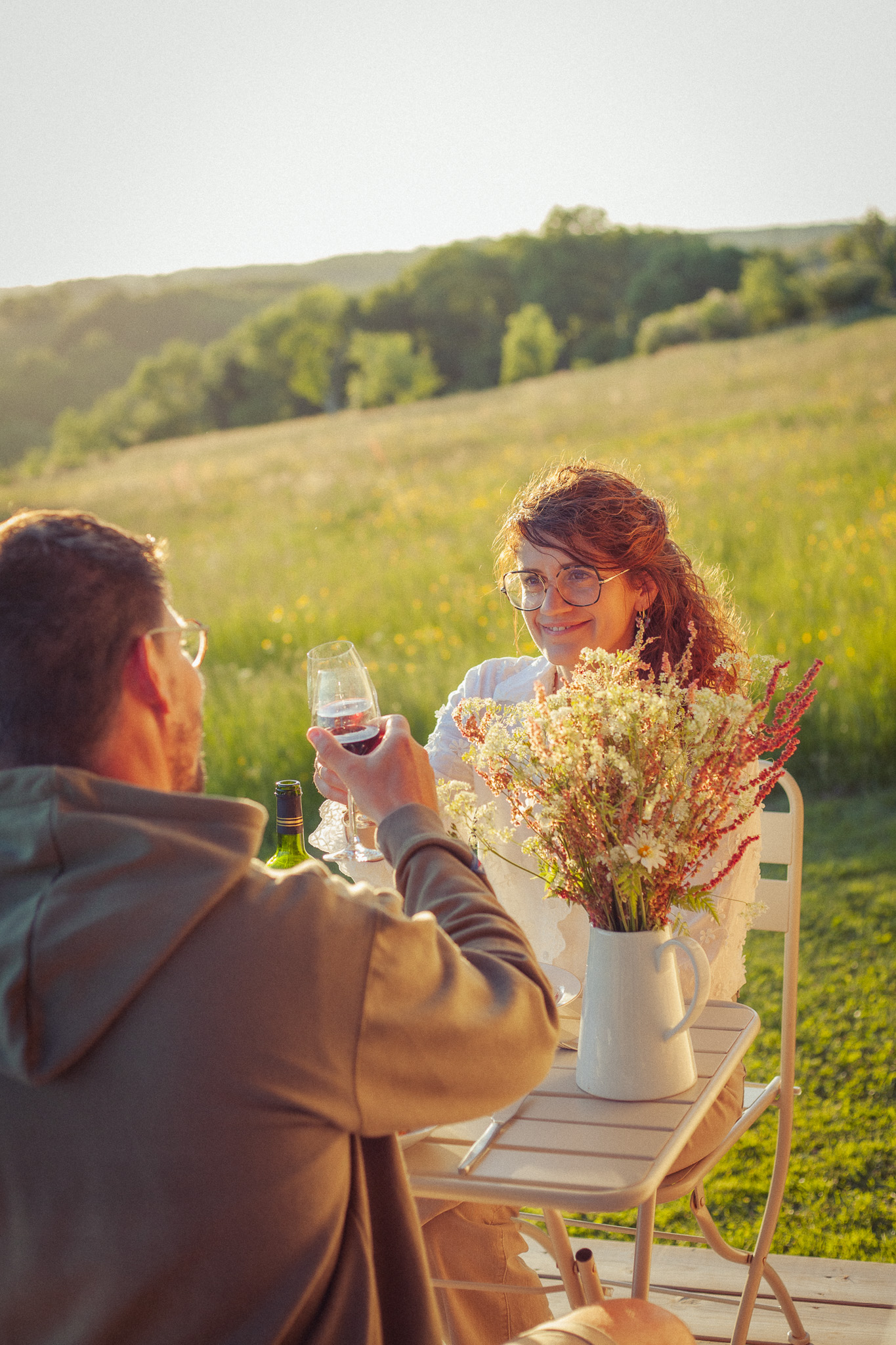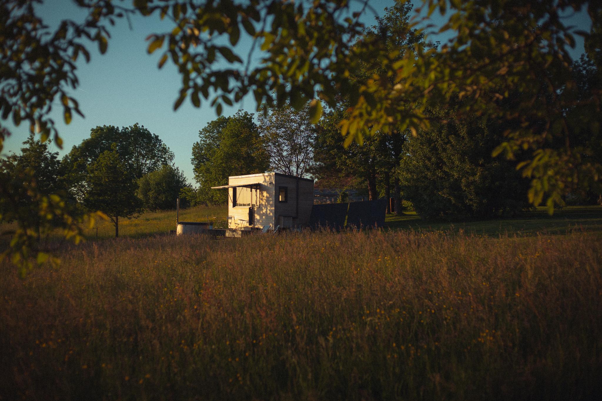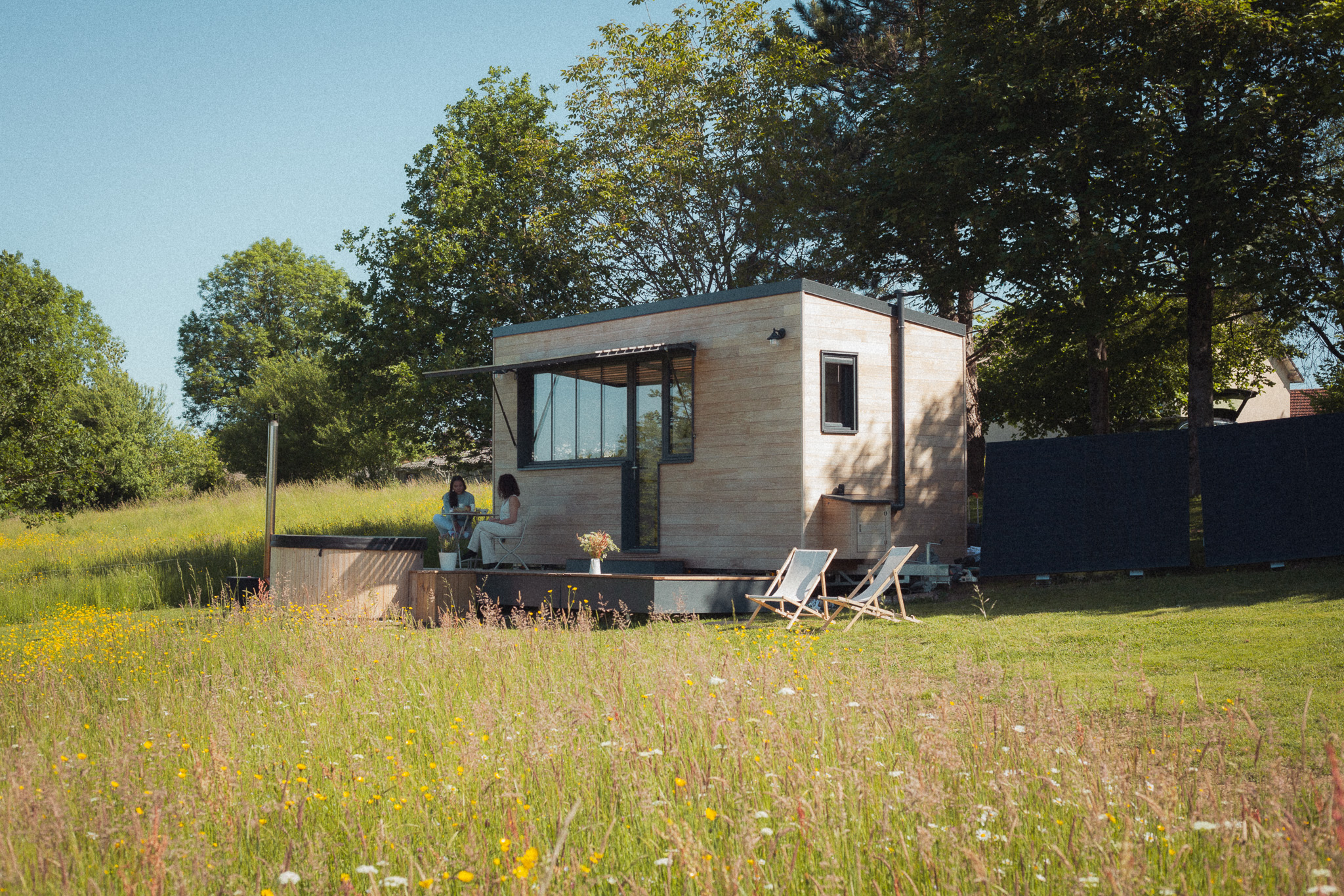 Sa terrasse s’ouvre sur un panorama apaisant de champs et de forêts, parfait pour savourer un moment de détente dans le bain nordique, été comme hiver.
