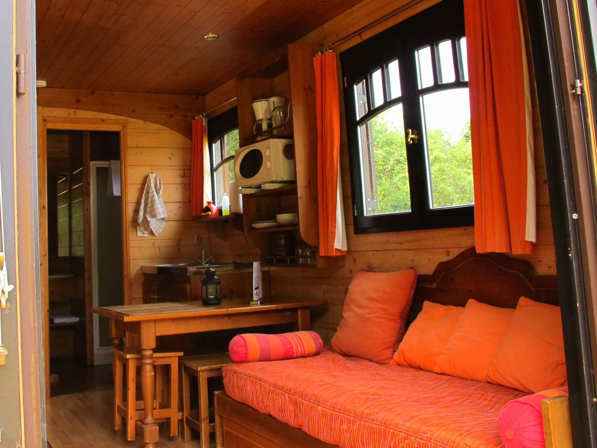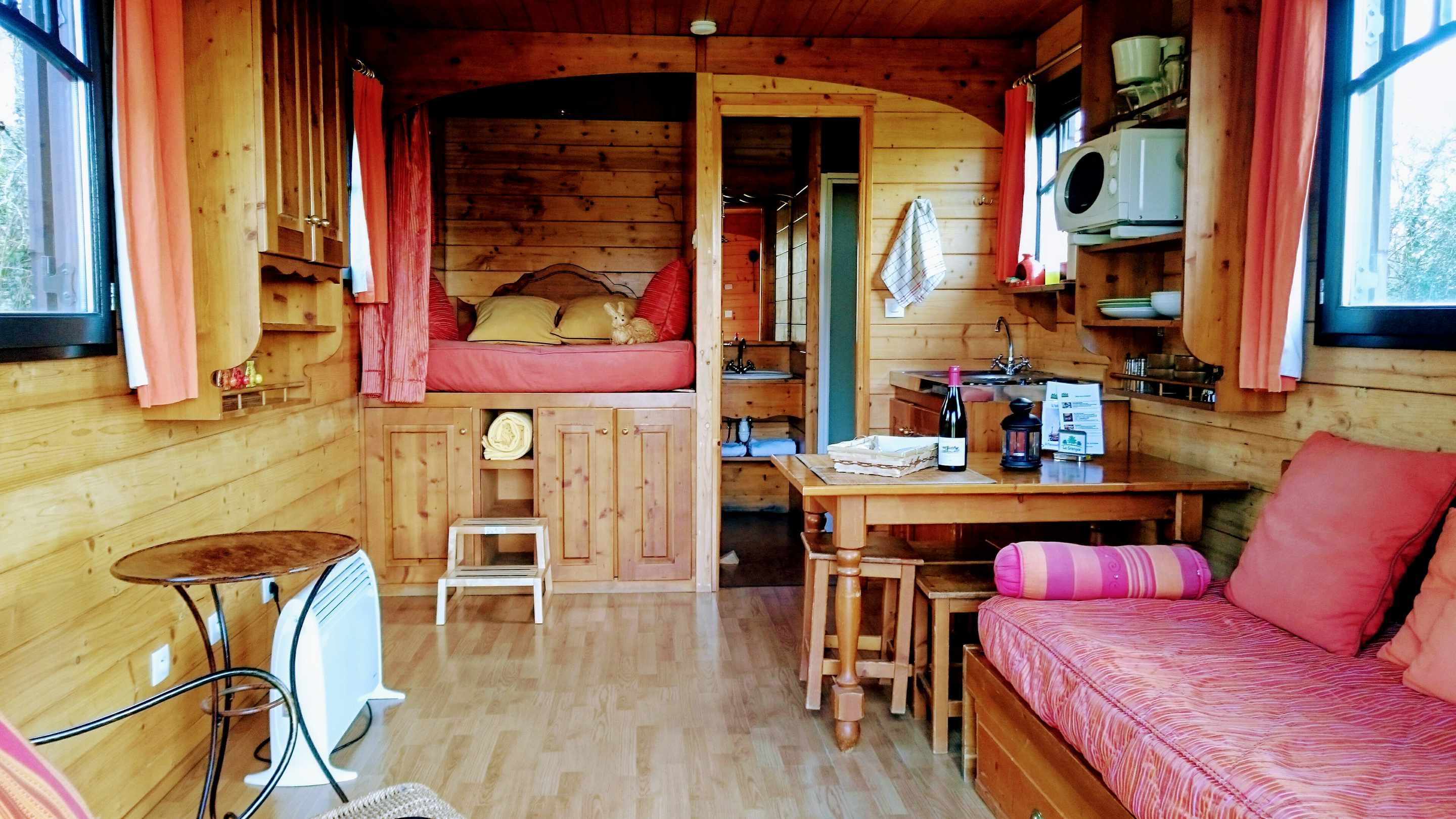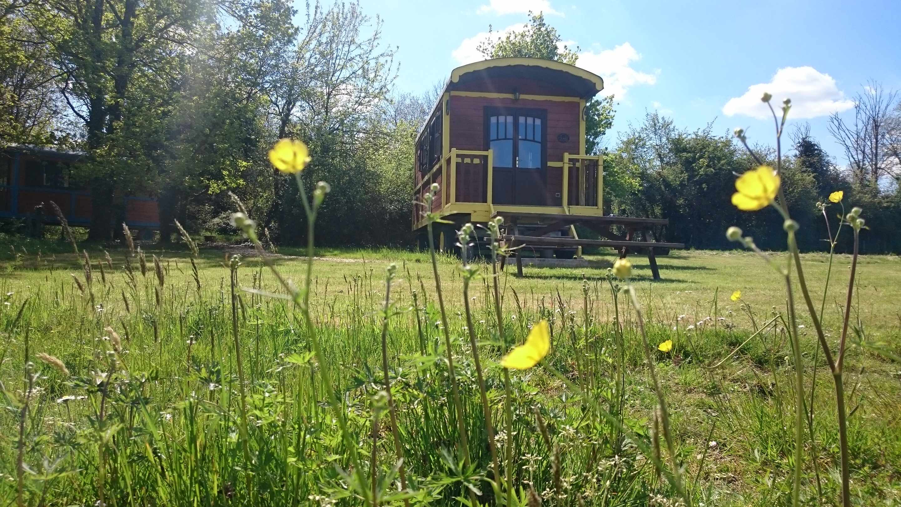 La Roulotte  Bouton d’or à l”esprit bohème, véritable invitation au voyage et symbole d’un nouvel art de vivre est installée face à la forêt et vous offre une vue imprenable sur le parc du Domaine . Elle est particulièrement bien ensoleillée. Son intérieur en bois et sa décoration dans les couleurs orangers sauront vous séduire.