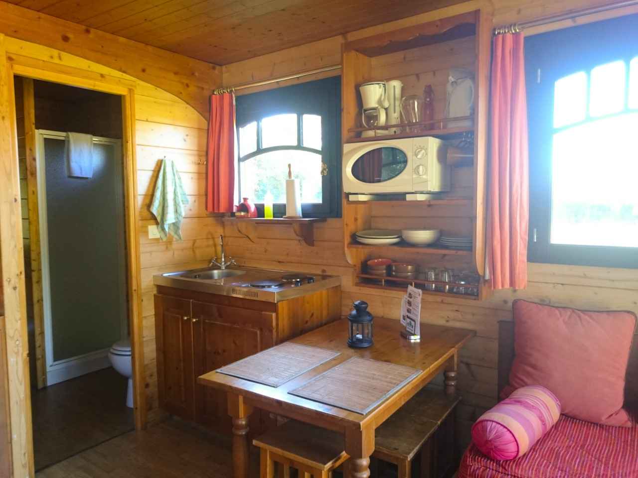 La Roulotte Bouton d’or est équipée d’un lit double en alcôve, d’une banquette/lit et un lit gigogne (matelas de qualité hotellière) pour accueillir jusqu’à 4 personnes, d’une salle d’eau avec douche, lavabo et WC, d’une kitchenette équipée avec vaisselle, réfrigérateur, 1 micro onde, 2 plaques électriques.