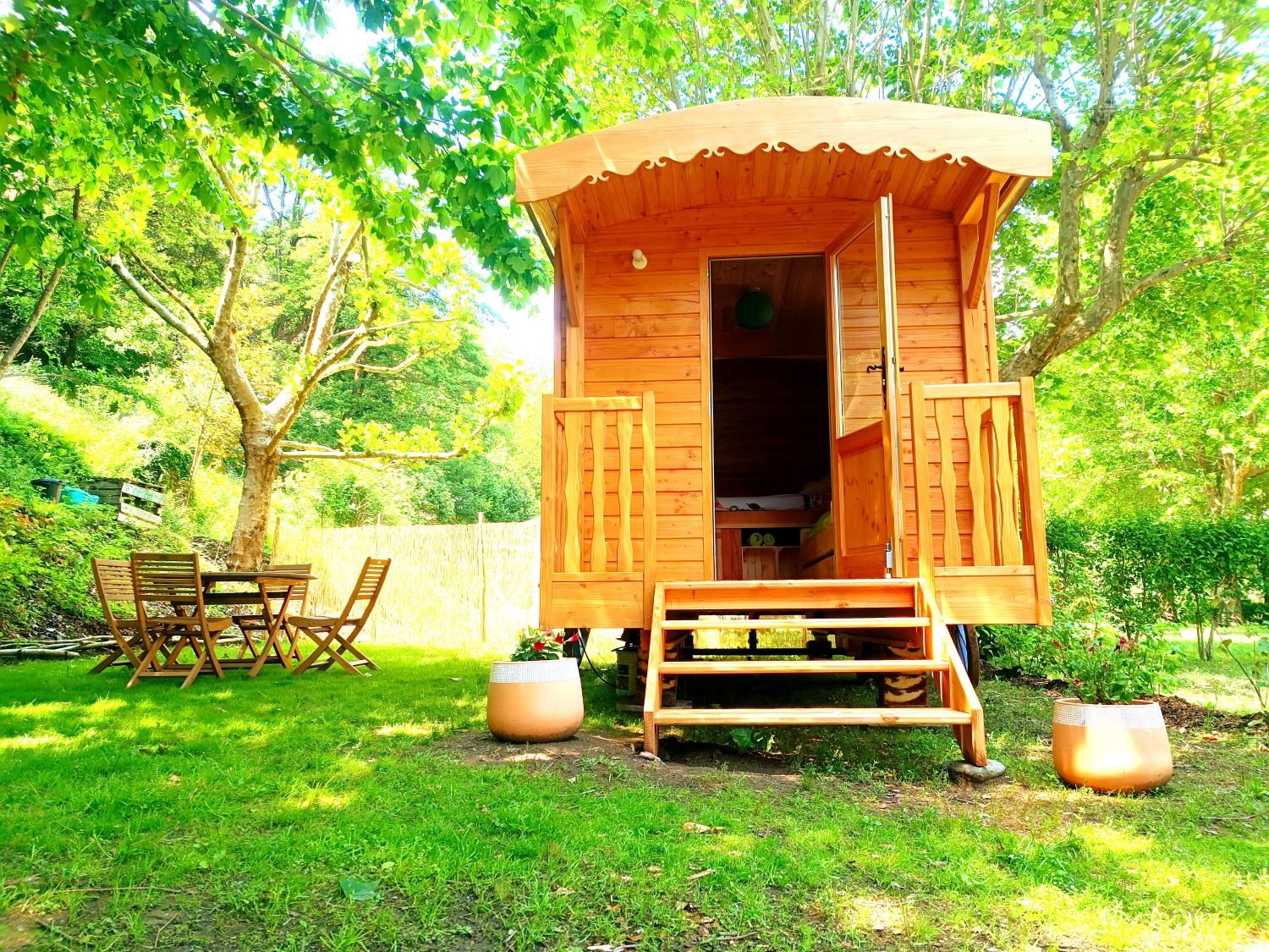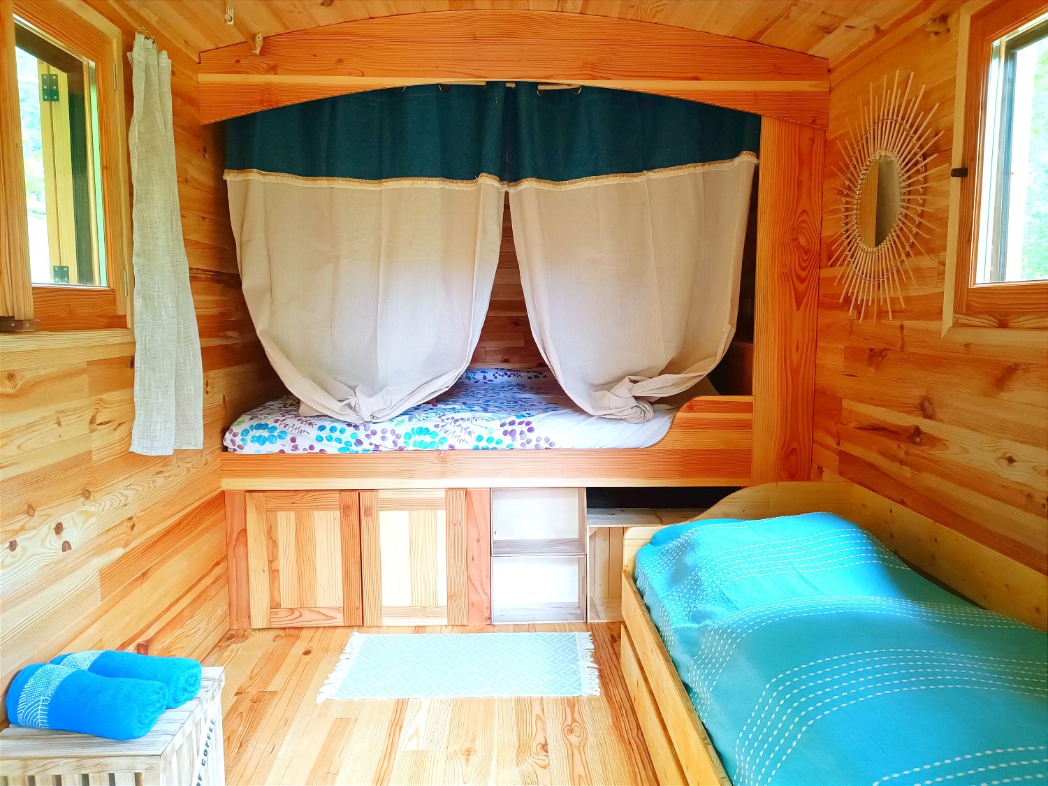 La roulotte Cévenole à l’ombre des platanes centenaires est idéale pour les petites familles avec deux lits enfants dans l’entrée et un lit parentale au fond avec un grand matelas en 160 en latex. En extérieur vous profitez d’une cuisine d’été et d’un salon de jardin (réfrigérateur, gaz, ustensiles de cuisine, cafetière à piston…). L’accès à la rivière du Luech se trouve à quelques pas de votre logement insolite.