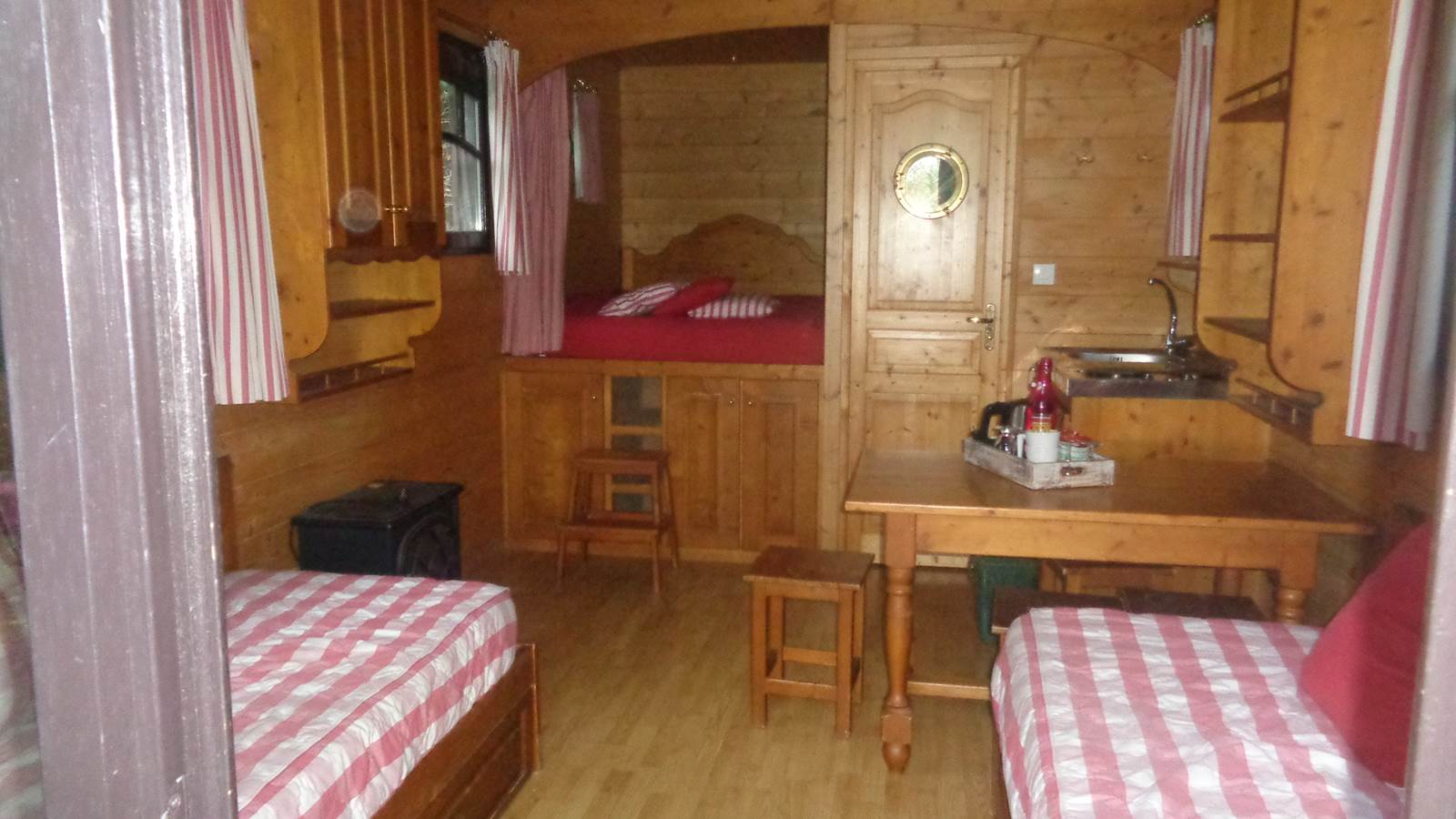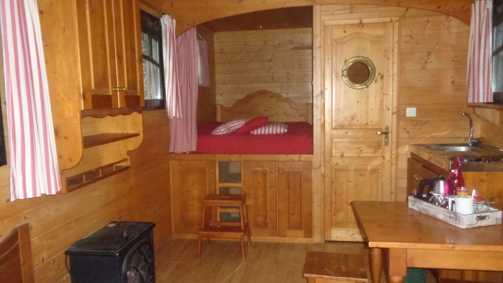 Installée dans un parc arboré, à 50 mètres de la maison, la roulotte « Campagne et Bois » vous séduira par son charme et son confort. Entièrement aménagée en bois, elle offre un vaste espace de vie avec un coin cuisine équipé (réfrigérateur, plaques électriques, bouilloire, cafetière, table, chaises et vaisselle), un lit en 140 fermé par un rideau, ainsi qu’un ensemble de deux canapés convertibles en lits de 90.