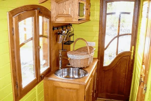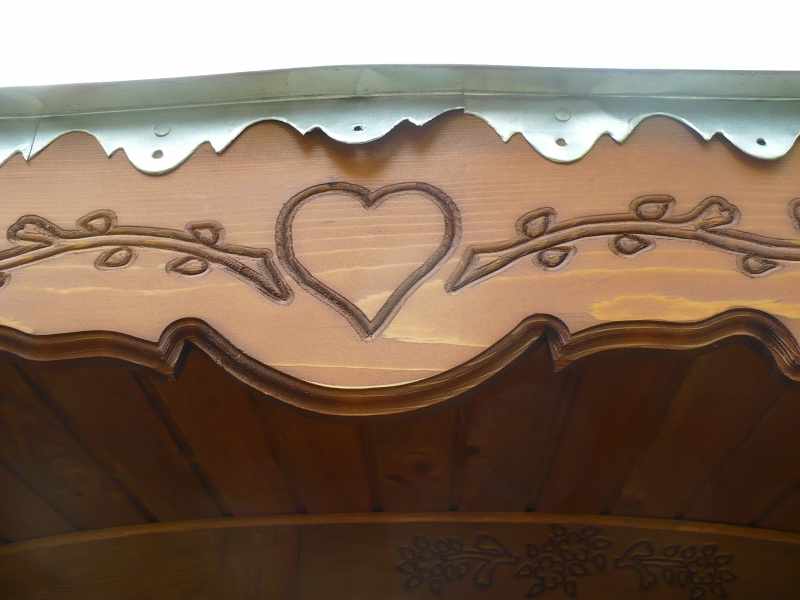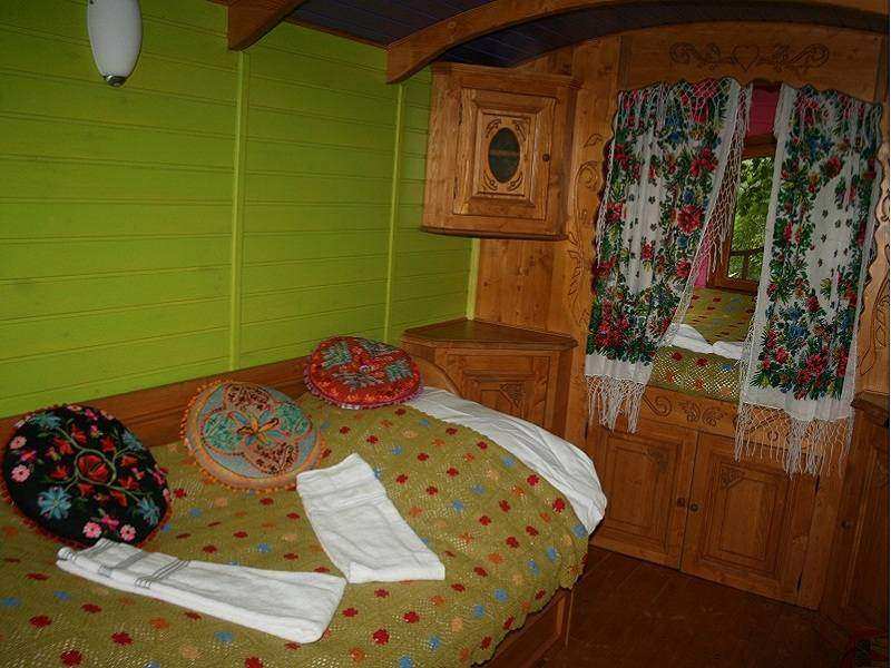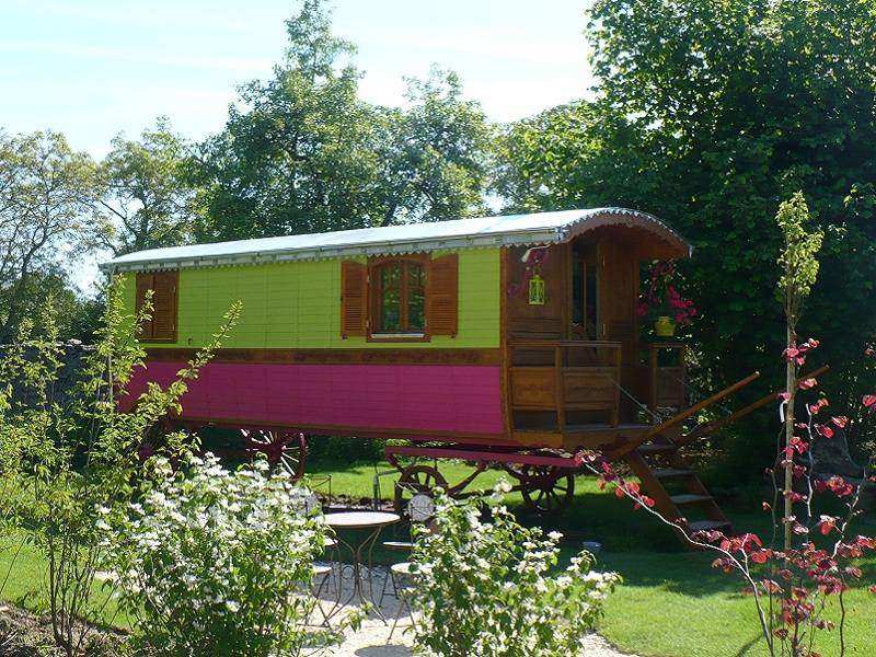 La roulotte gîte de charme a fait halte pour vous offrir un refuge pour des vacances originales. Cette roulotte est fabriquée à la main à partir d’arbres issus de la forêt des Carpates par des artisans Tziganes considérés comme les maîtres dans ce domaine. Cette véritable œuvre d’art contribue à la sauvegarde d’une tradition séculaire. Cadre métallique et arc de suspension forgés selon les techniques traditionnelles, roues en bois, frises en bois sculptées manuellement à la gouge, toit en zinc réalisé à la main par des artisans zingueurs… autant d’éléments qui forgent le caractère de cette roulotte. Véritable invitation au voyage pour votre week-end en amoureux, pause bohème pour les vacances, notre roulotte évoque certains lieux où le temps semble avoir interrompu sa course.