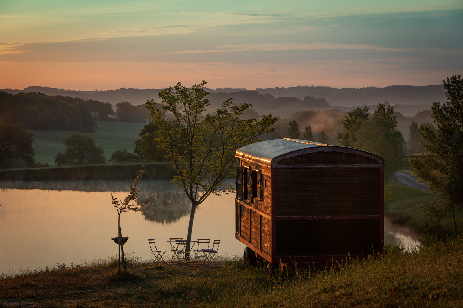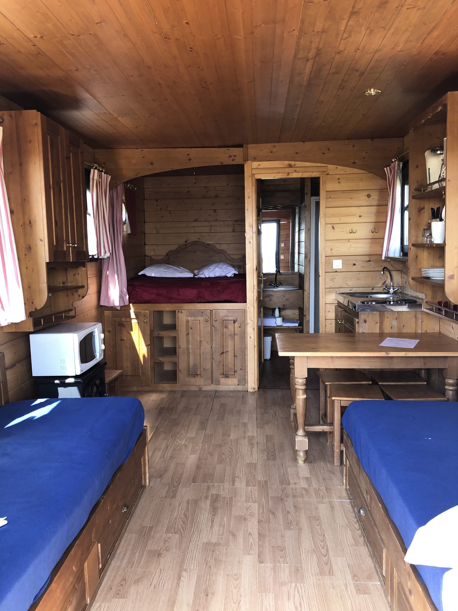 Nos roulottes sont situées en pleine campagne, dans un lieu naturel et sans voiture. Elles sont équipées d’un coin cuisine et d’un coin salle de bain qui vous fait sentir comme « chez vous ». De plus, vos lits seront faits à votre arrivée et vous disposerez du linge de toilettes pour que vous vous sentiez le plus possible en vacances. Joliment décorées et pensées pour accueillir 5 personnes, elles se distinguent par leur couleur. Vous pourrez profiter d’un barbecue privatif et d’un mobilier de jardin.