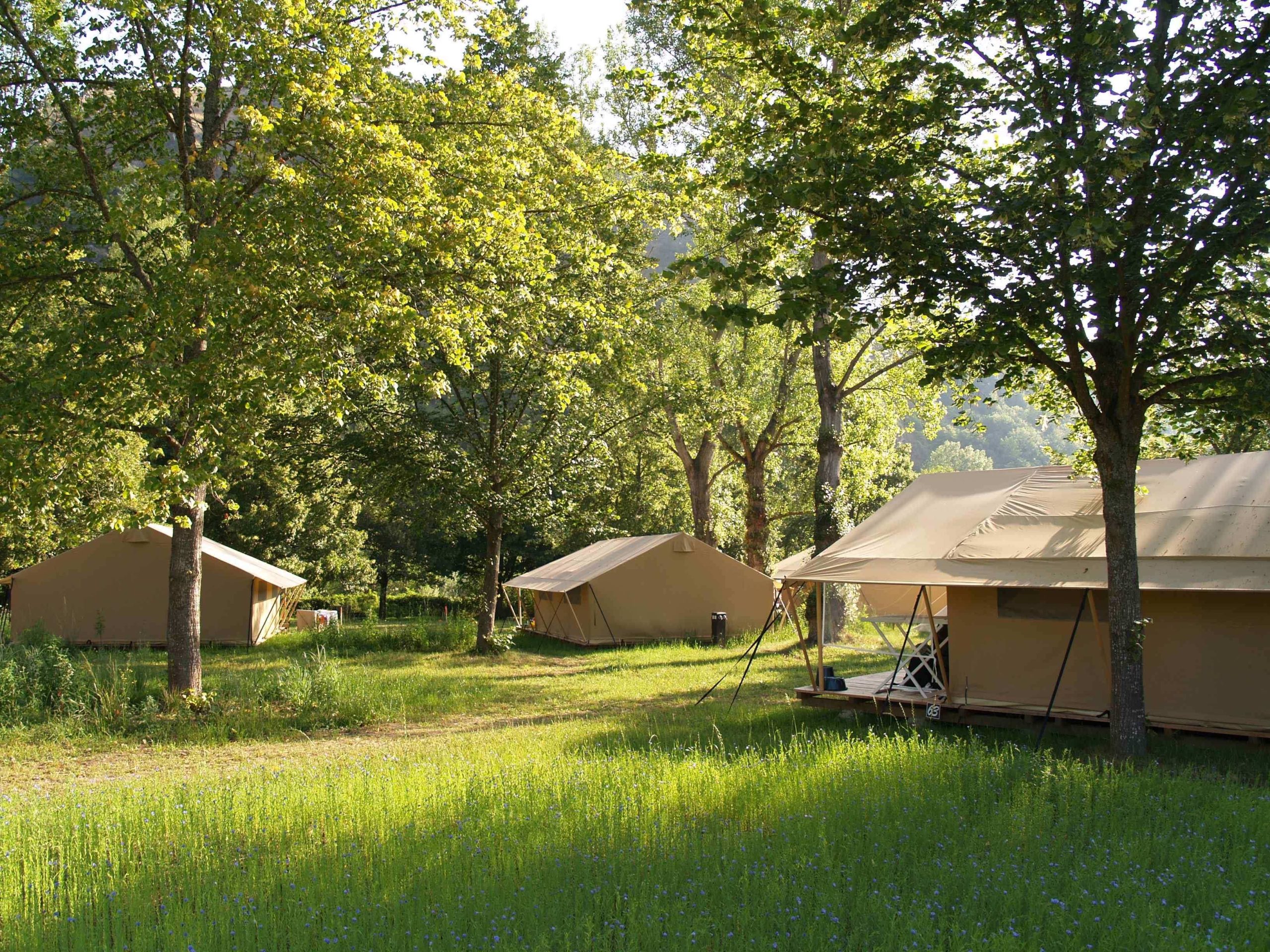Sur un vaste emplacement de 200m², la tente trappeur est installée sur un plancher de 35m², ses ouvertures sont modulables et sa grande terrasse est ombragée.