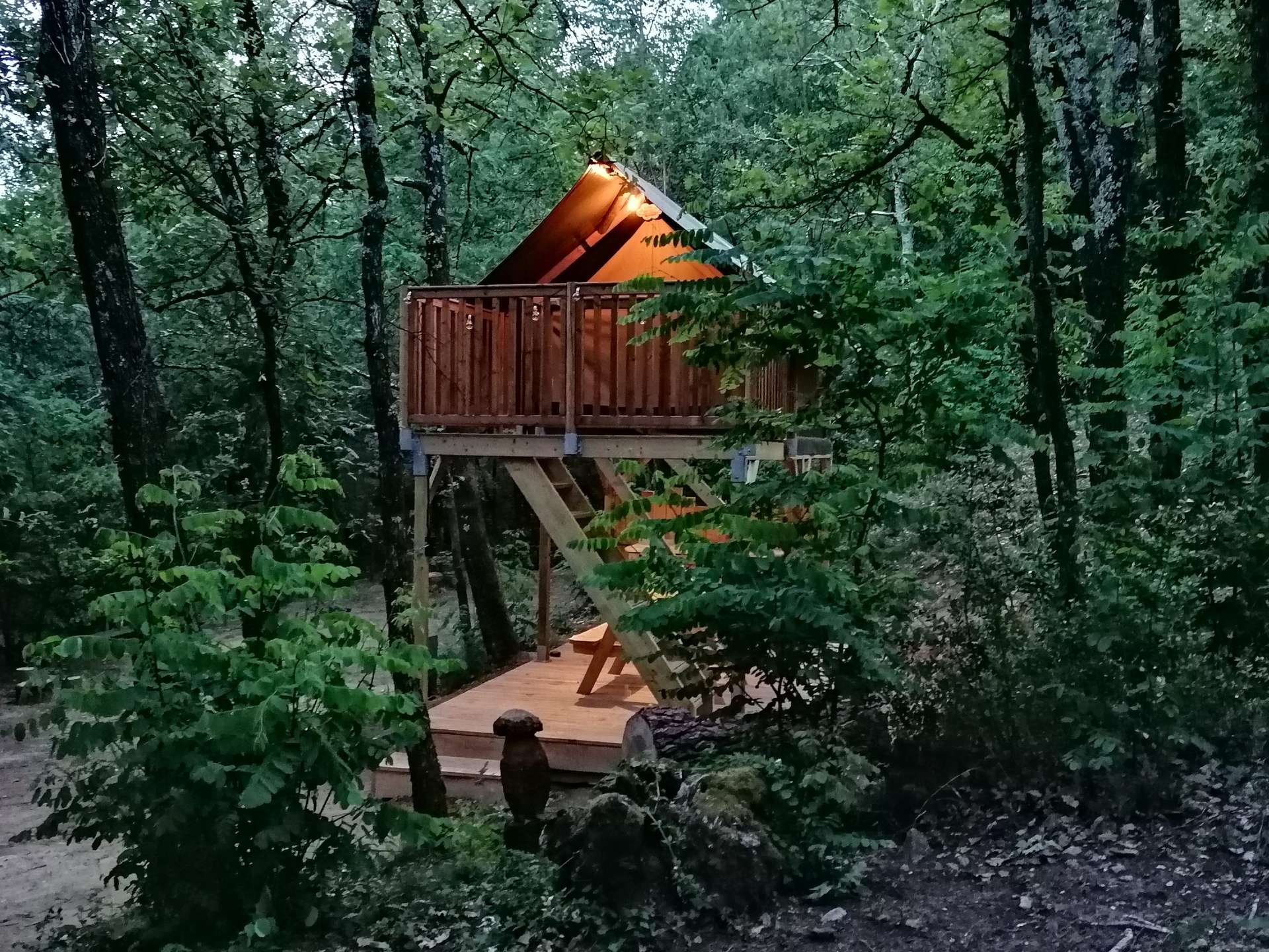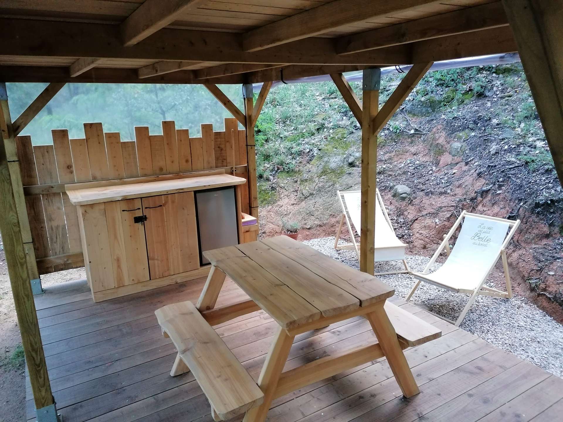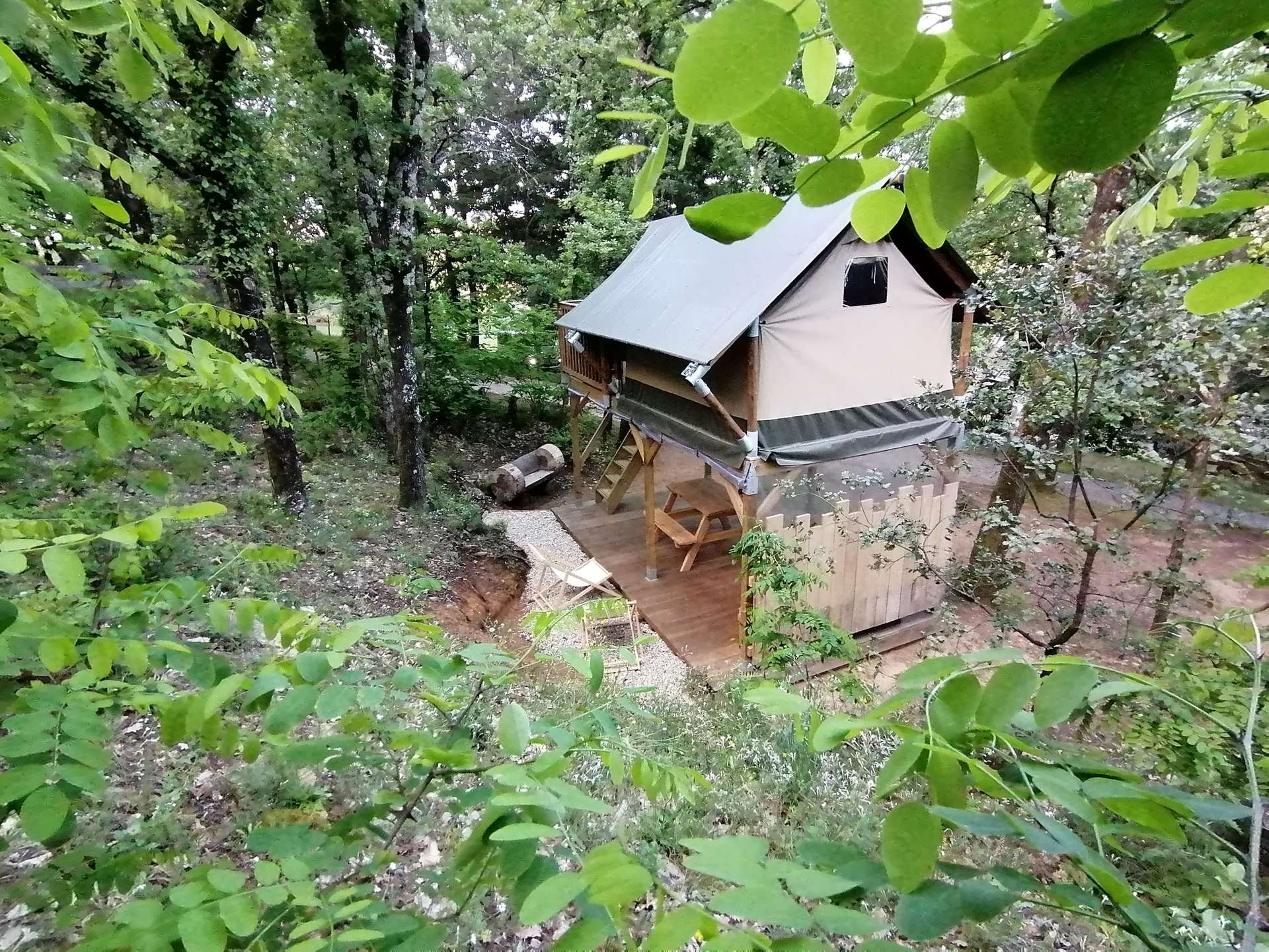 La tente ECUREUIL 2 personnes de 12,5 M2 sur pilotis à 2 mètres de haut avec le nécessaire pour cuisiner ( plaque gaz-frigo top), terrasse au réz de chaussée avec table de pique nique et meuble de cuisine équipé .(pas de sanitaire dans la tente – sanitaire sur le camping).
