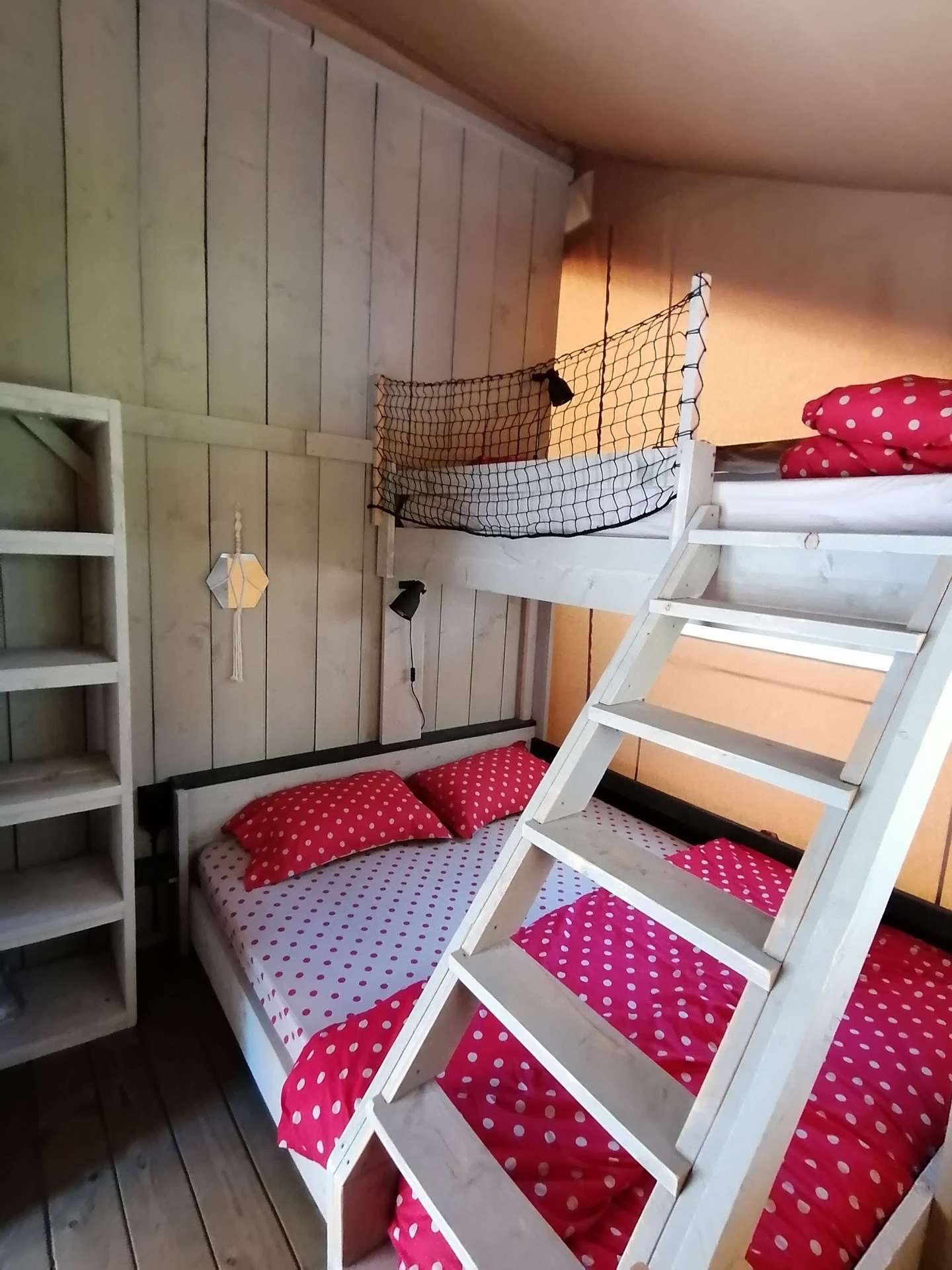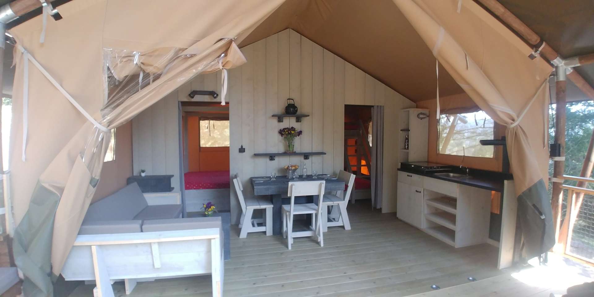 La tente RENARD 5 personnes de 40 M2 toute équipée (pas de sanitaire dans la tente- sanitaire sur le camping . Toilette sèche sur place),cuisine (plaque gaz, frigo top), tout le nécessaire de cuisine. 2 chambres ( 2 et 3 personnes), salon, coin repas, terrasse avec table pique nique, barbecue collectif. Location de drap 10 euros par lit .