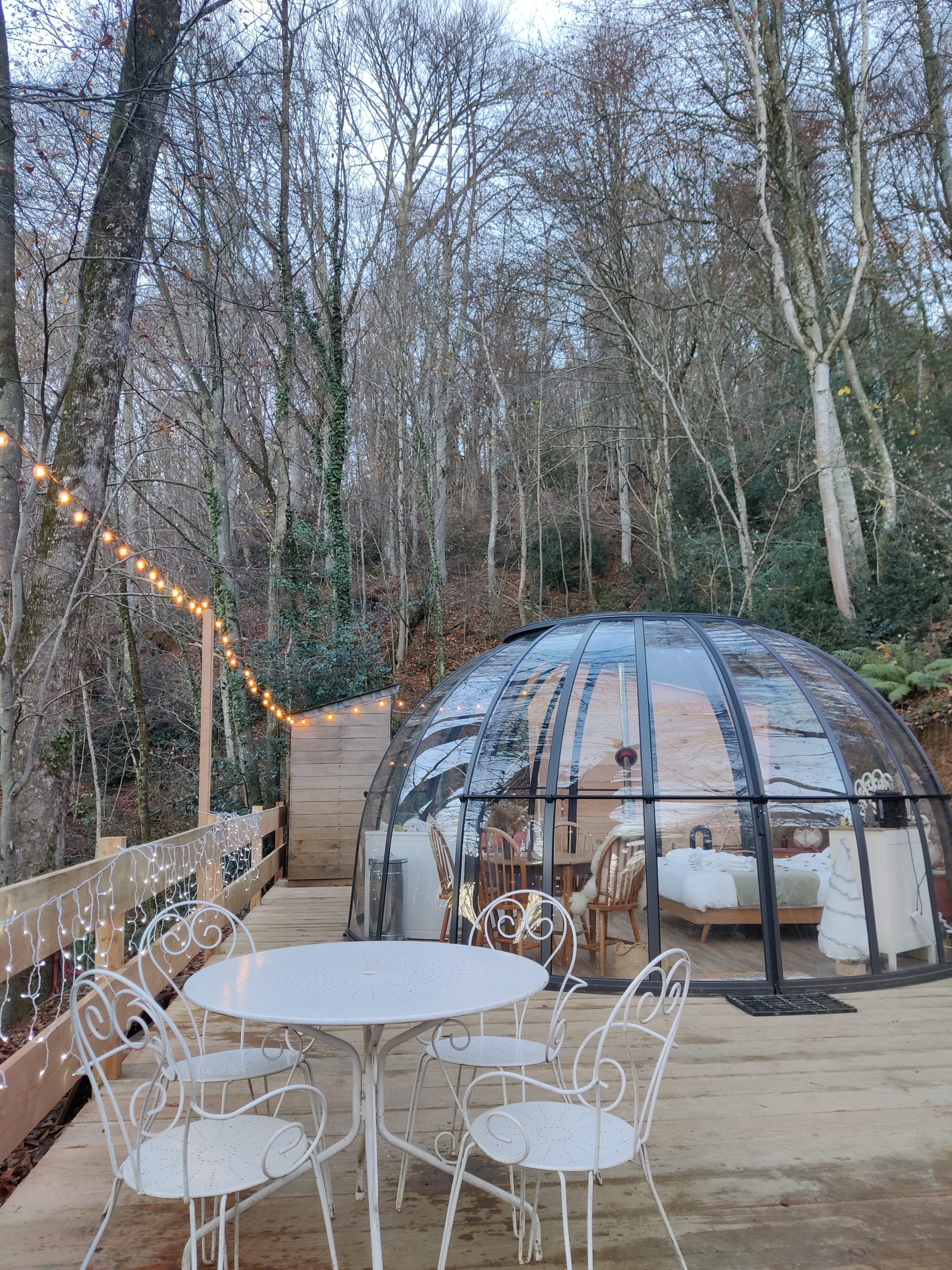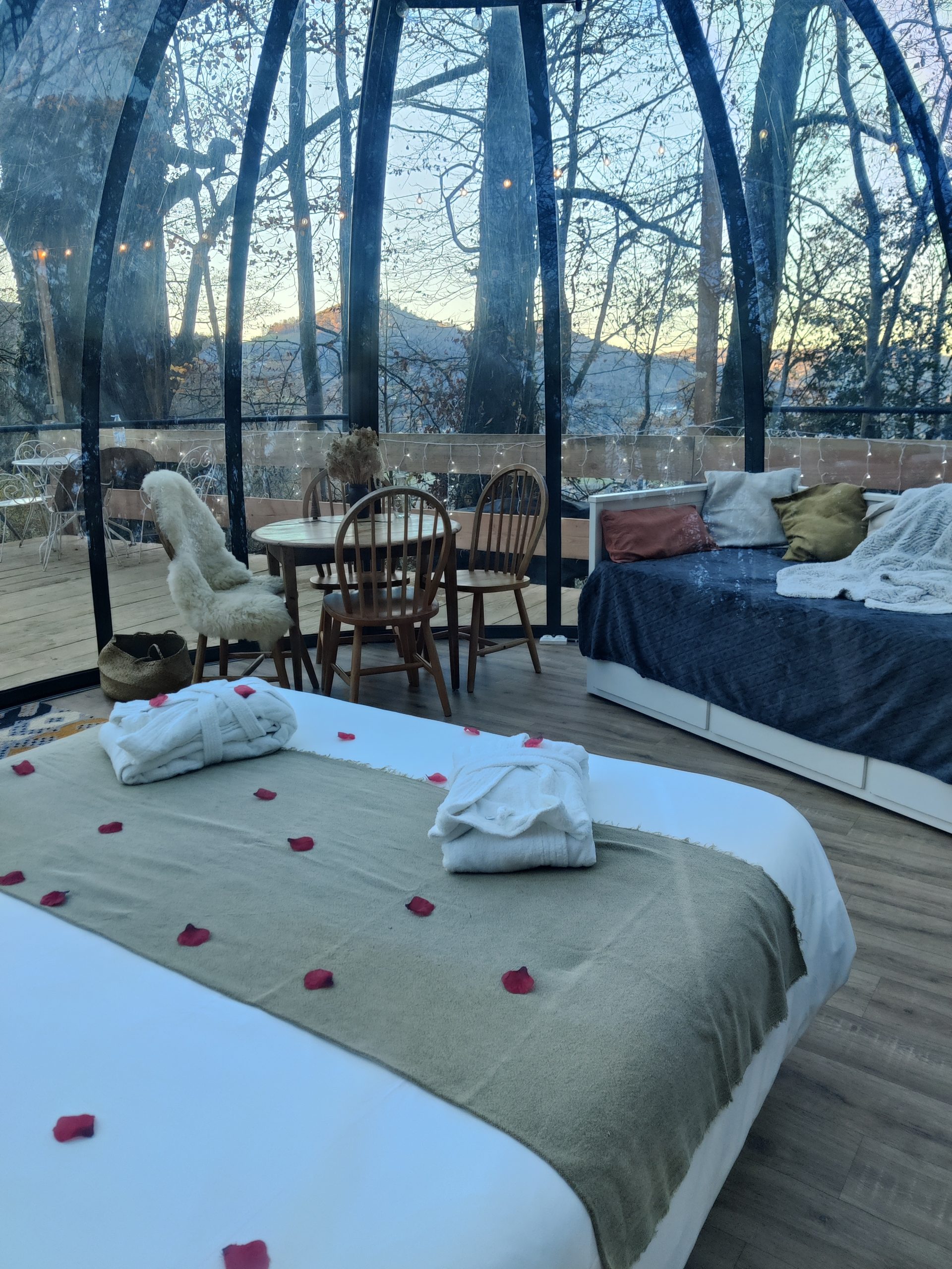 Le Dôme Transparent fait 5 mètres de diamètre et peut accueillir de 2 à 4 personnes. Il est donc idéal qu’on soit en couple, en famille ou entre amis grâce à ses deux couchages : un lit double et un second couchage modulable en lit simple ou en lit double (il devient un canapé pour plus de confort et d’espace si vous n’êtes que deux).