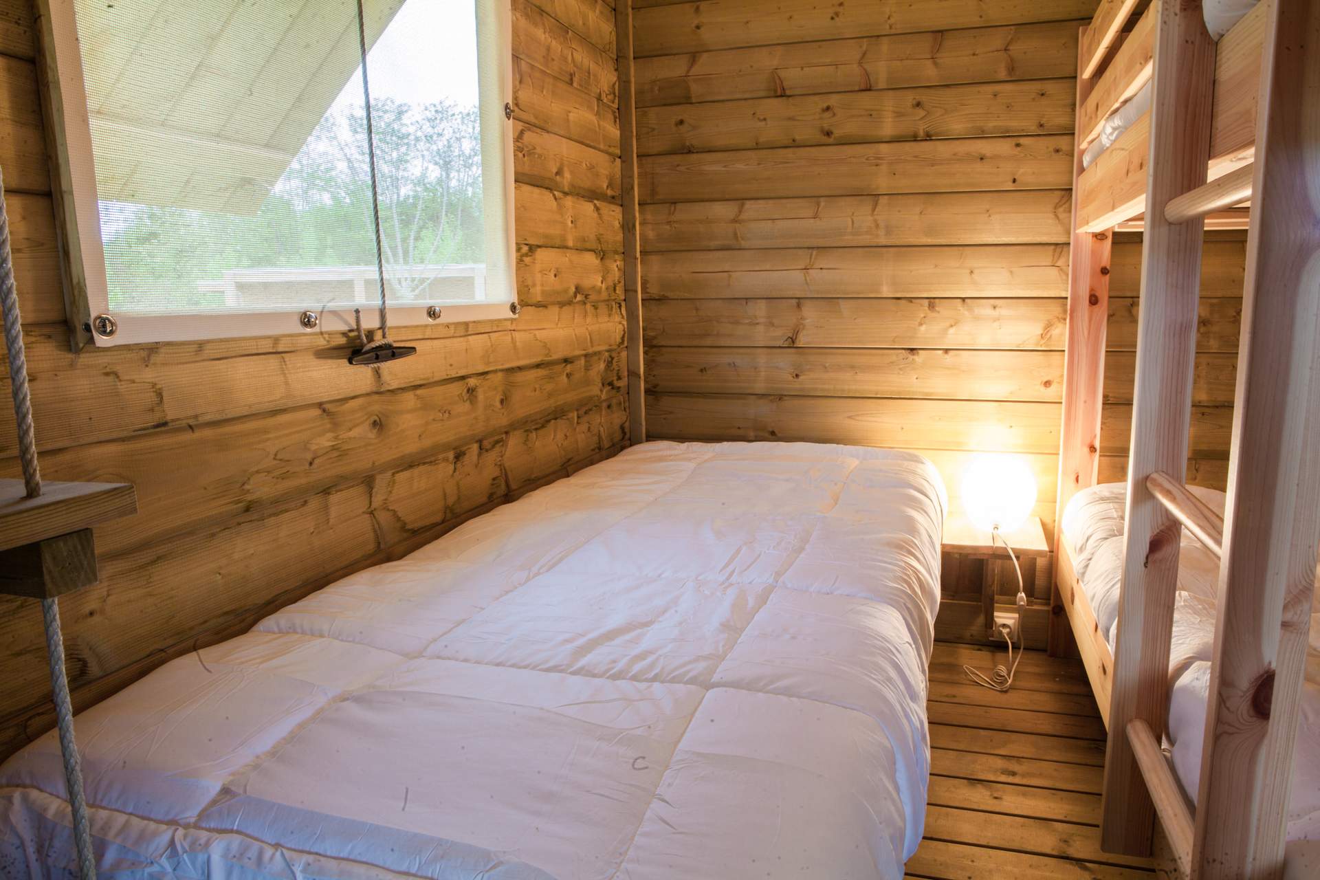 Perchées à 1m20 du sol, nos Tentes Safari sont uniques. Elles sont équipées d’une salle de bain, d’un coin cuisine, de l’électricité et de 2 chambres. Niveau literie, un lit 2 places (140×200), un lit superposé (80×190) et 1 lit simple (80×190), complètent l’équipement de ces tentes safari.