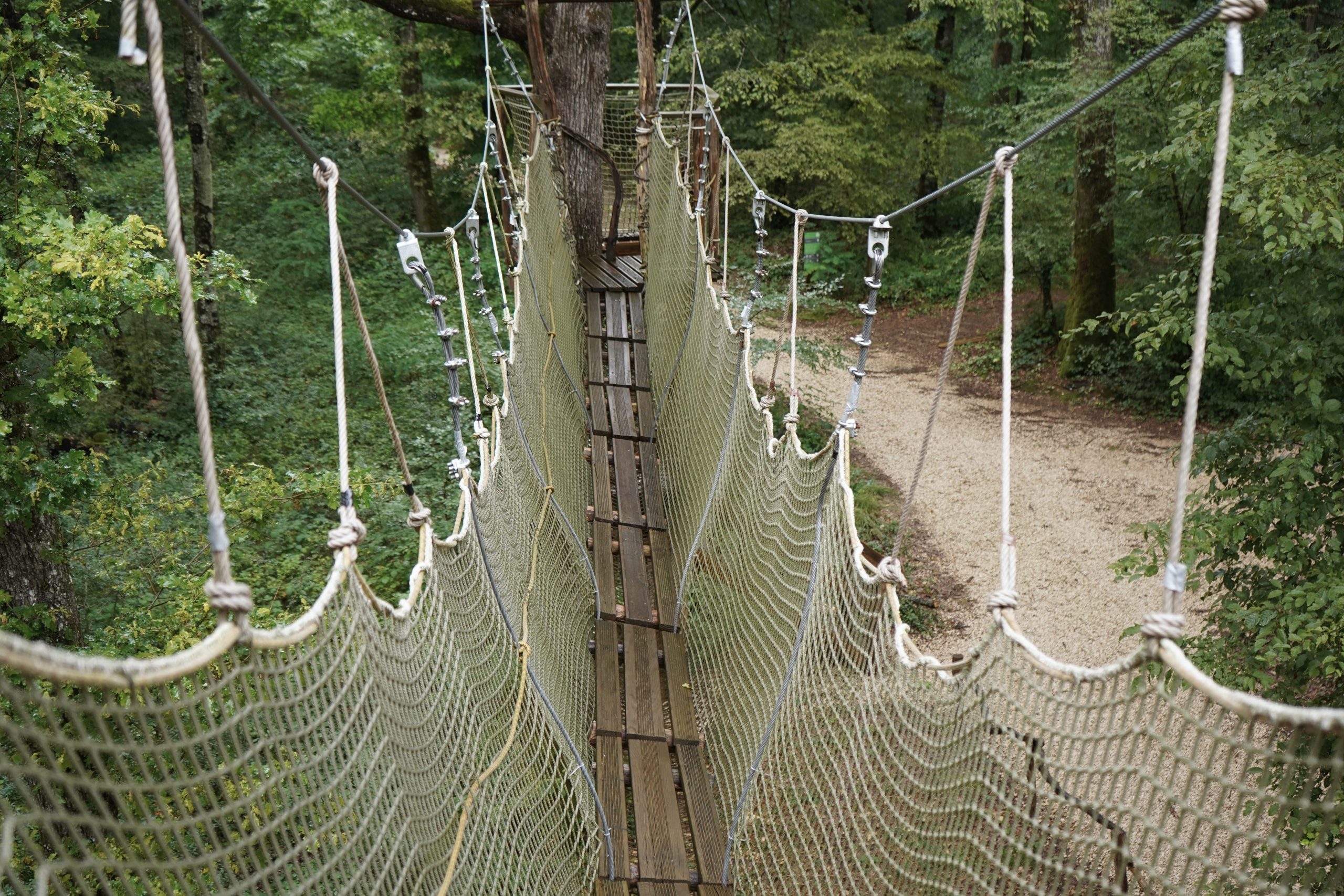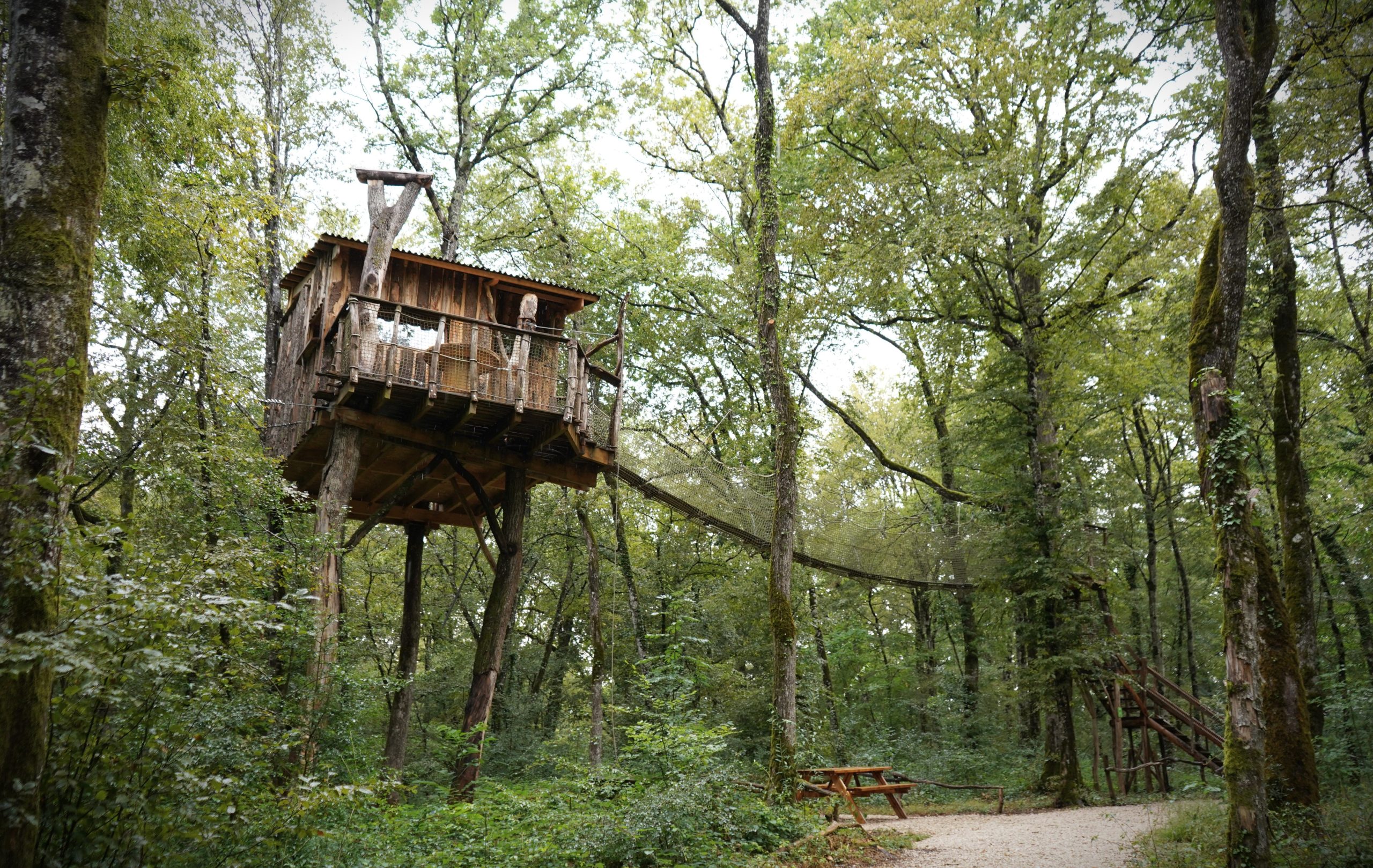 Cabane à 7 mètres de haut avec accès par échelle, escalier et pont de singe.