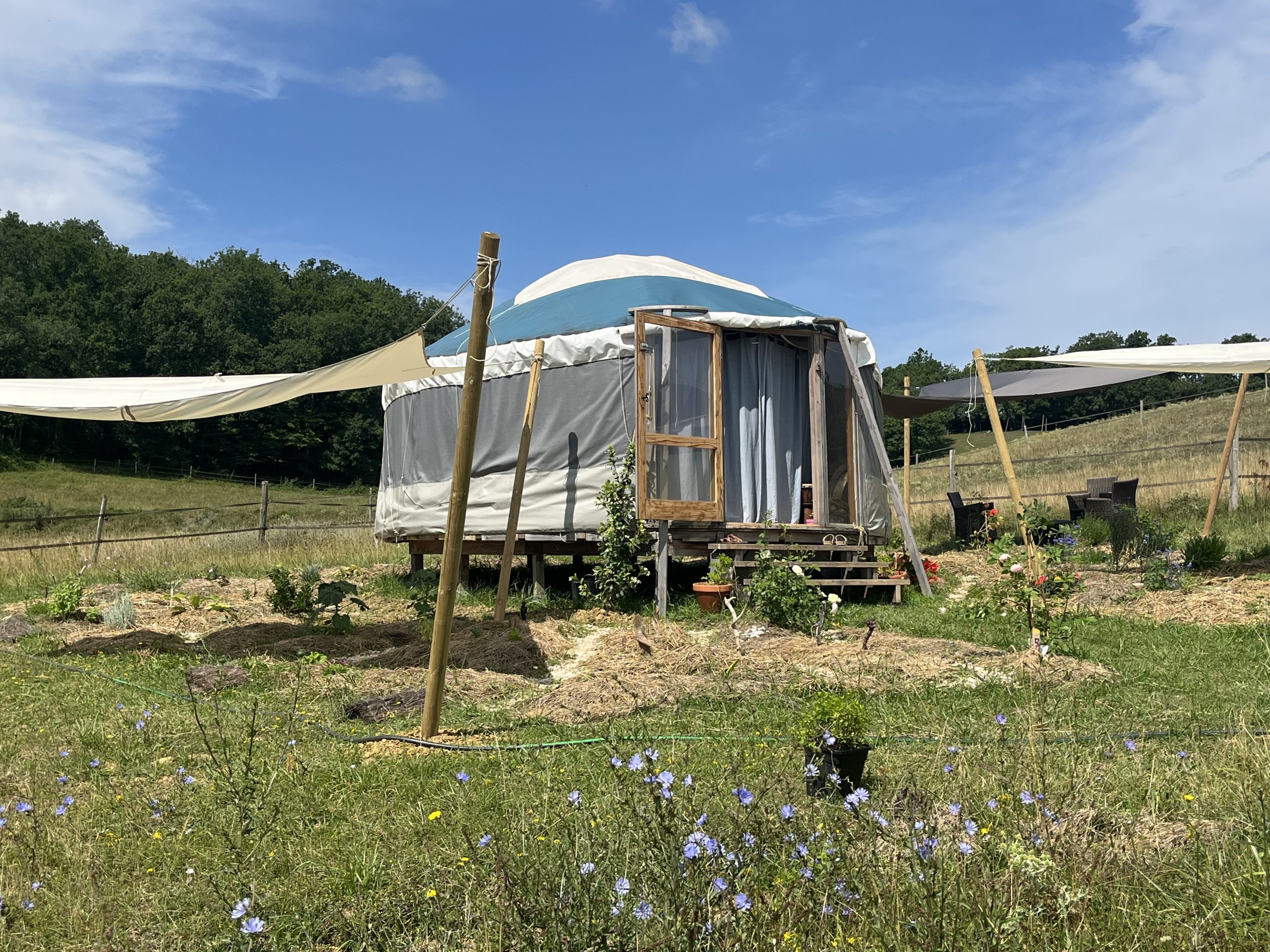 Yourte non chauffé en toile et bois, plancher légèrement surélevé.