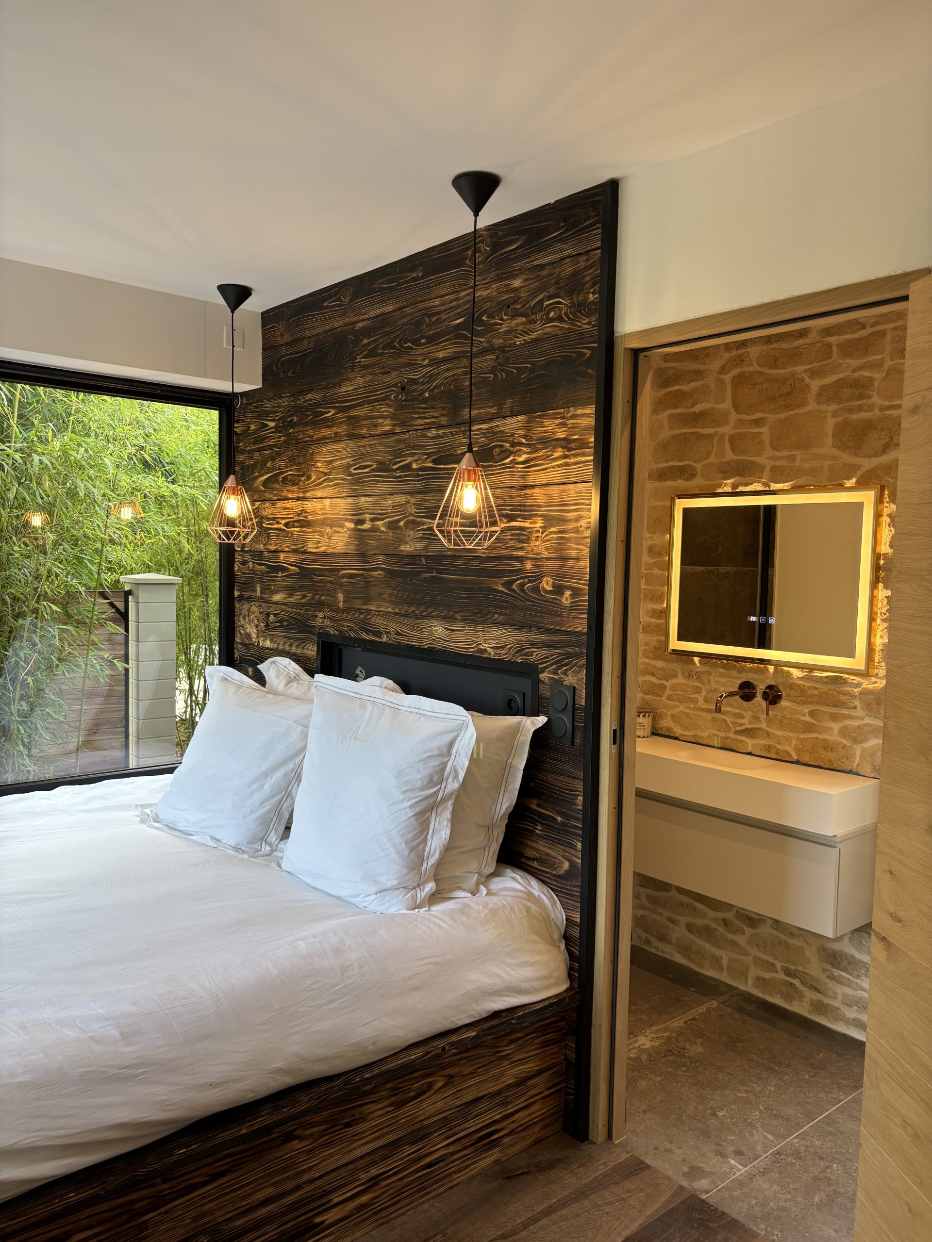 Pièces baignées de lumière, décorées avec des matériaux nobles alliant le bois et la pierre, pour une ambiance chaleureuse et contemporaine.
