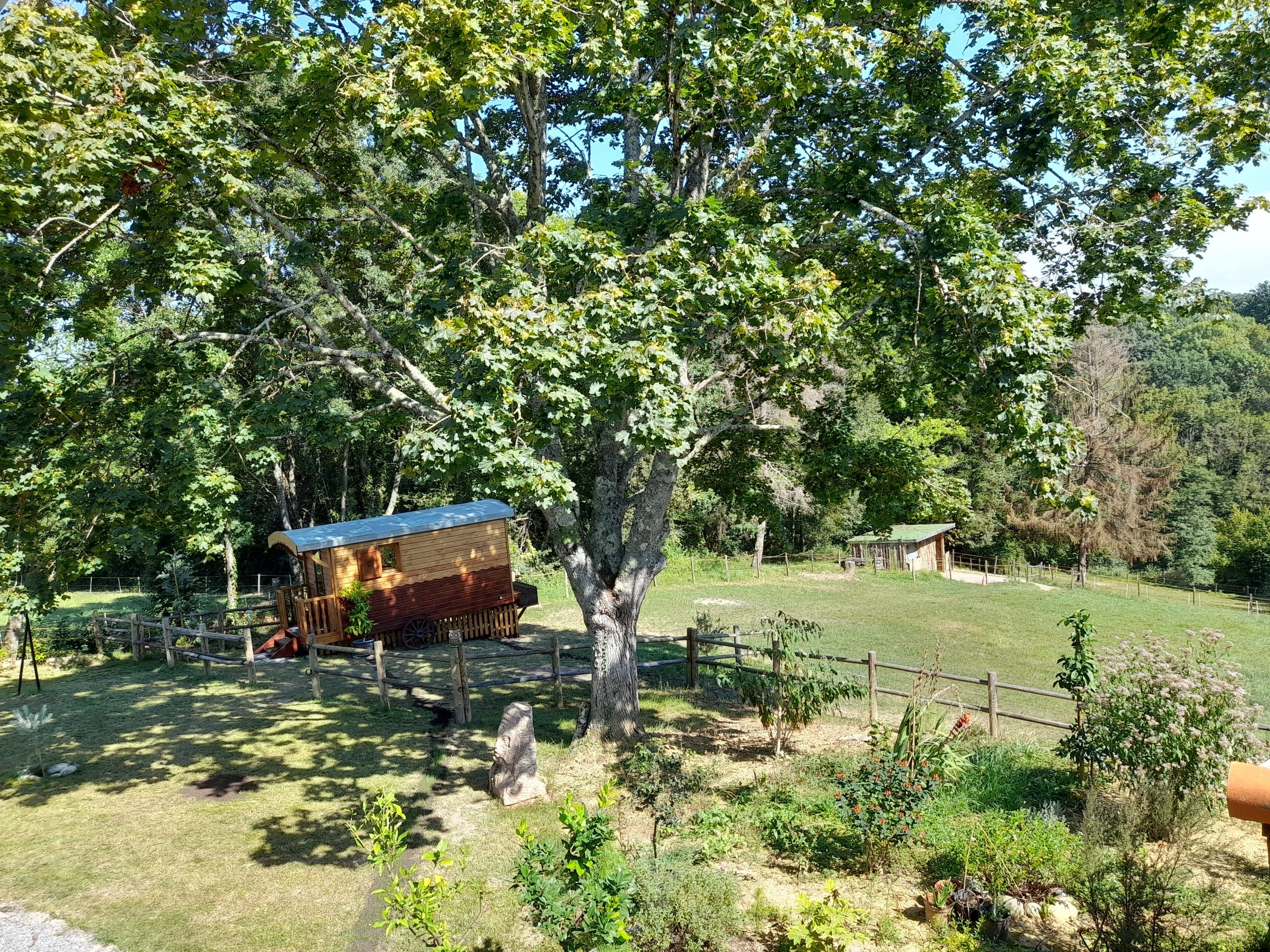 A coté de la roulotte, vous trouverez une salle de bain d’été privative et de toilette sèche.