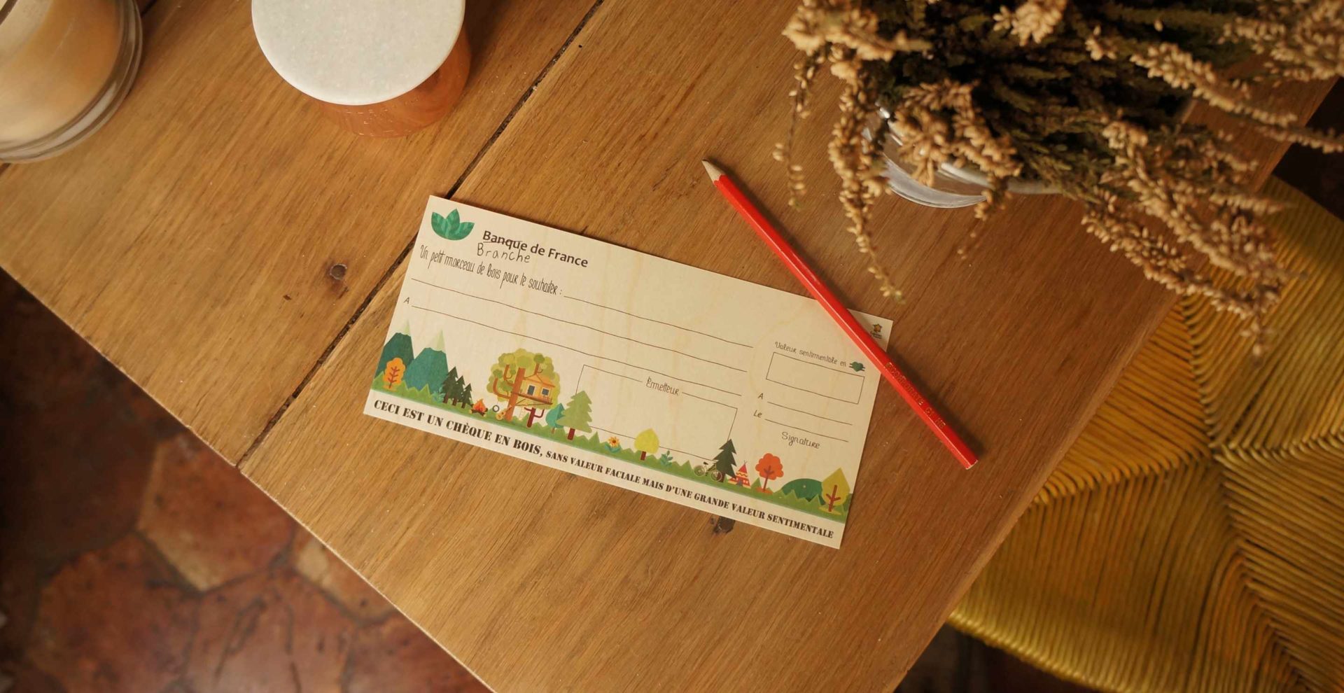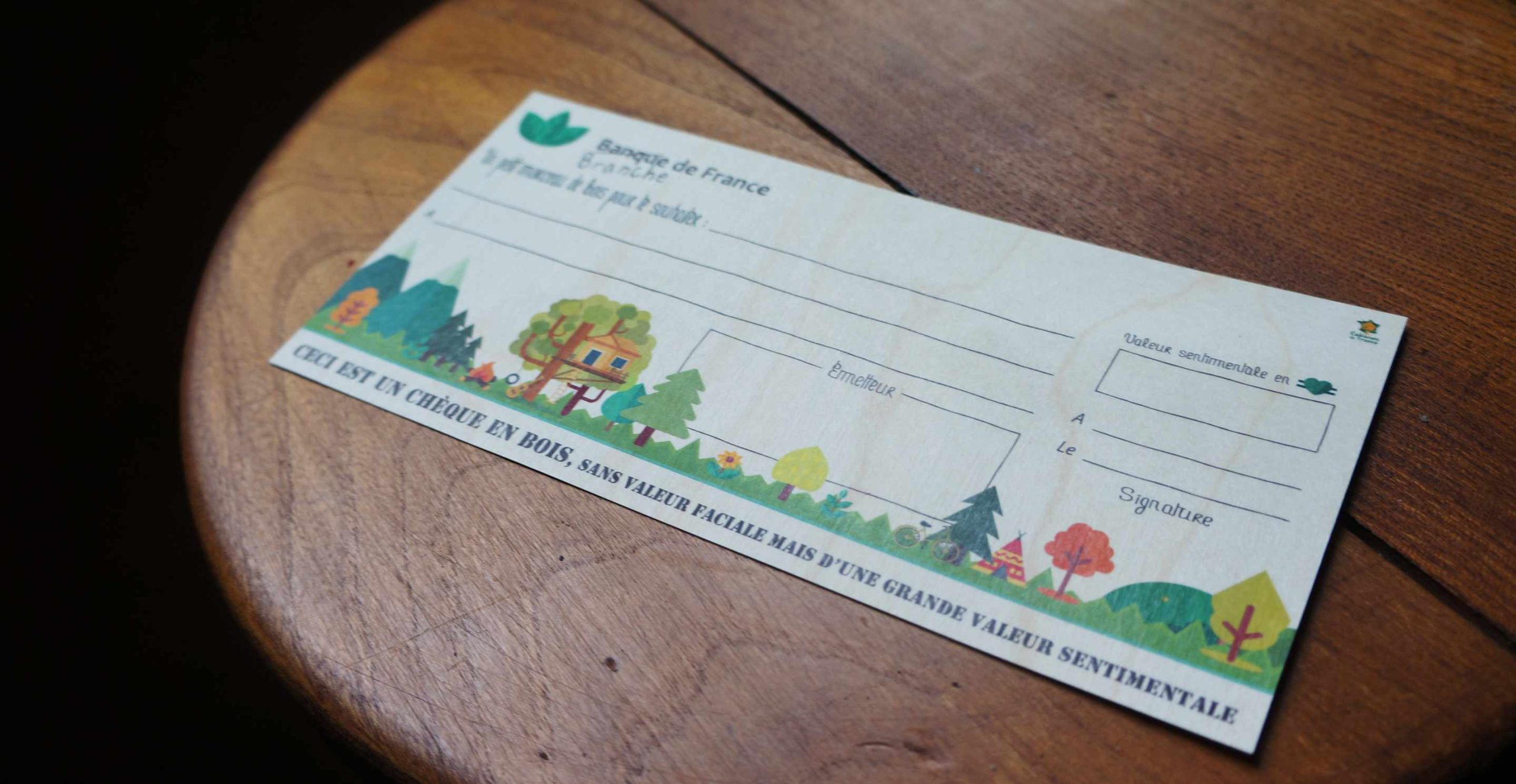 Un véritable chèque en bois de hêtre. Comme son nom l’indique, ce chèque en bois ne pourra pas être déposé en banque !