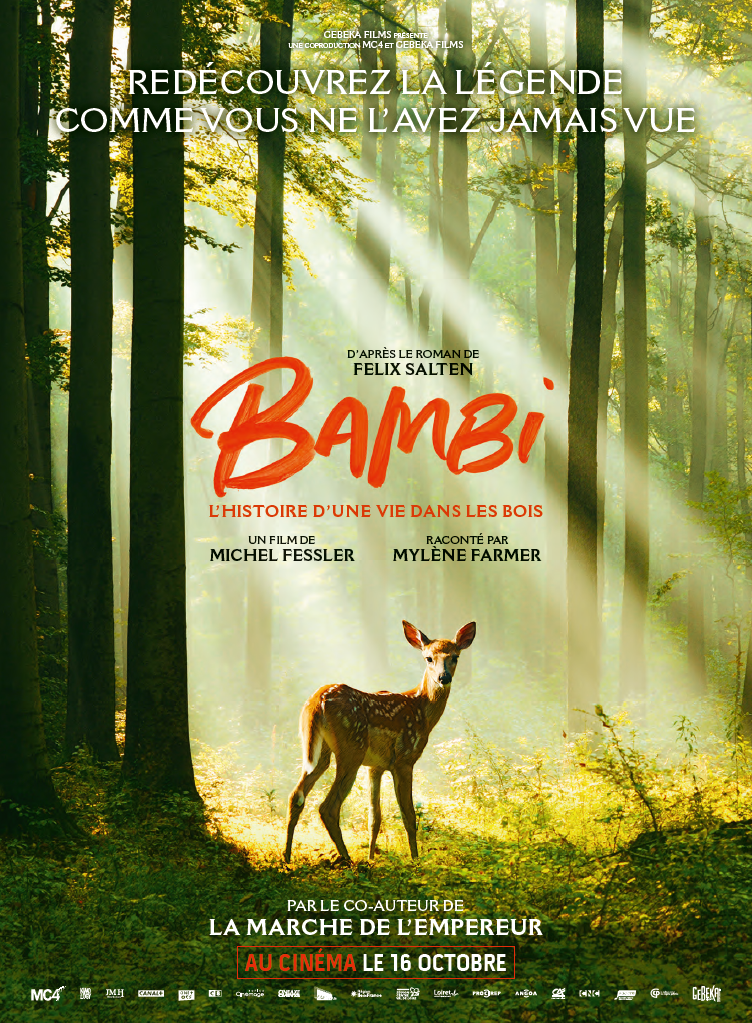 Le 16 octobre 2024 sortira dans les salles obscures un grand classique des contes pour enfants : BAMBI, L’HISTOIRE D’UNE VIE DANS LES BOIS.  La particularité de ce film, à la différence de la version bien connue de Walt Disney est qu’il a été tourné grandeur nature, dans la région Centre Val de Loire avec de vrais animaux (faons, biches, daguet, cerf, corneille, lapin, raton laveur, loup…). Une prouesse incroyable pour les équipes du film qui ont du faire preuve d’une grande patience pour saisir les plans souhaités. Cette histoire, d’après l’œuvre de Felix Salten, que l’on sait très émouvante, est racontée par Mylène Farmer.