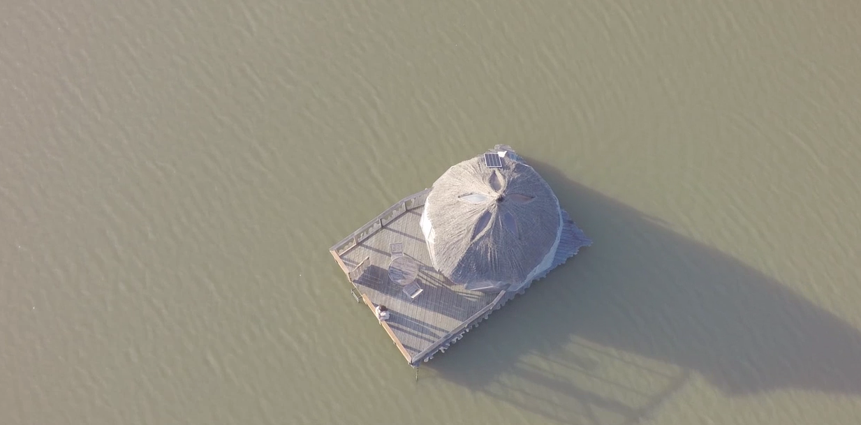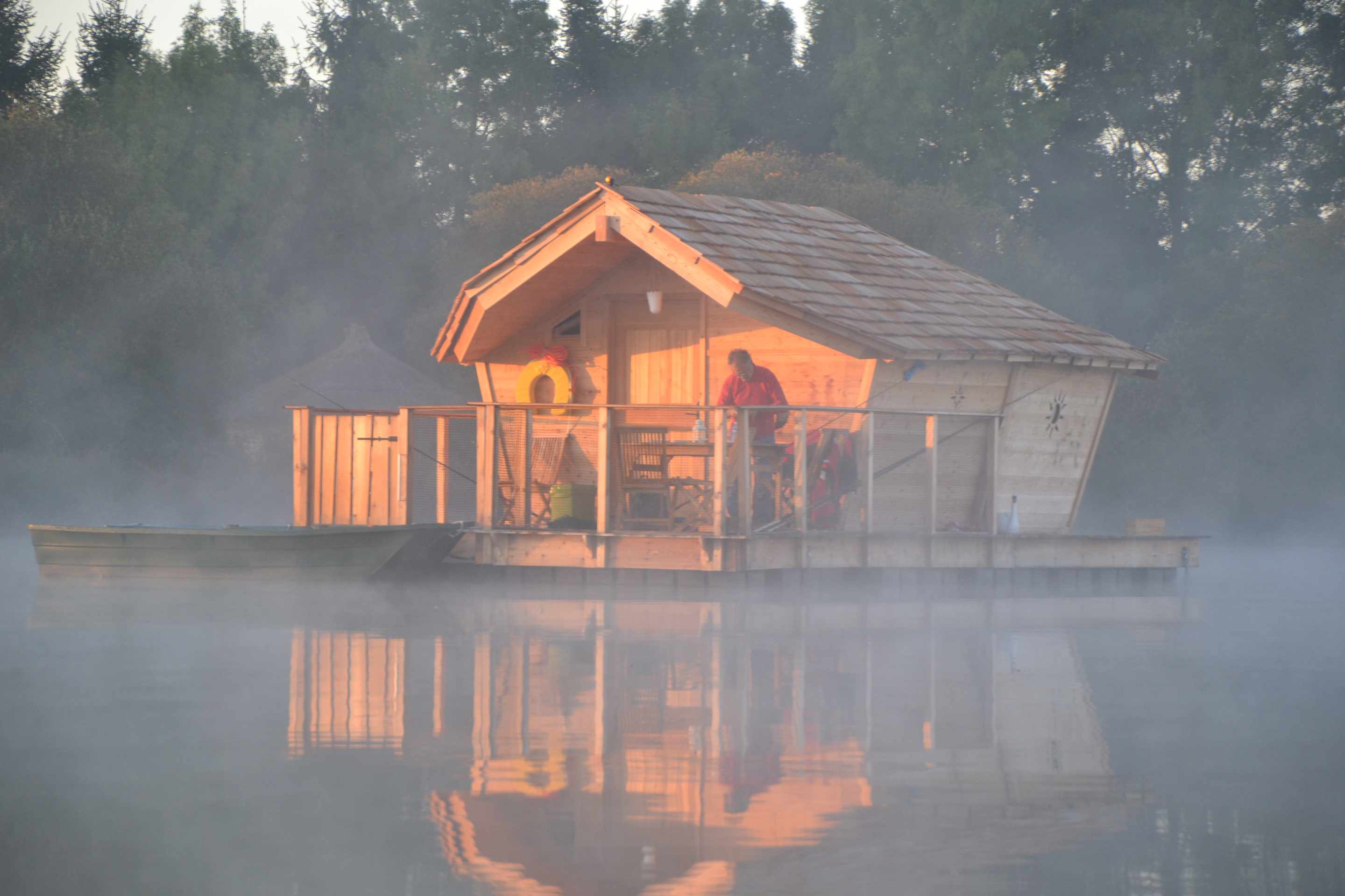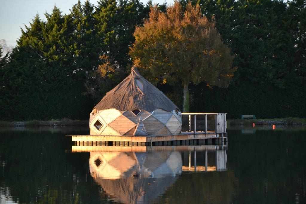 Cabane flottante sur un lac, entourée de verdure et deau calme.