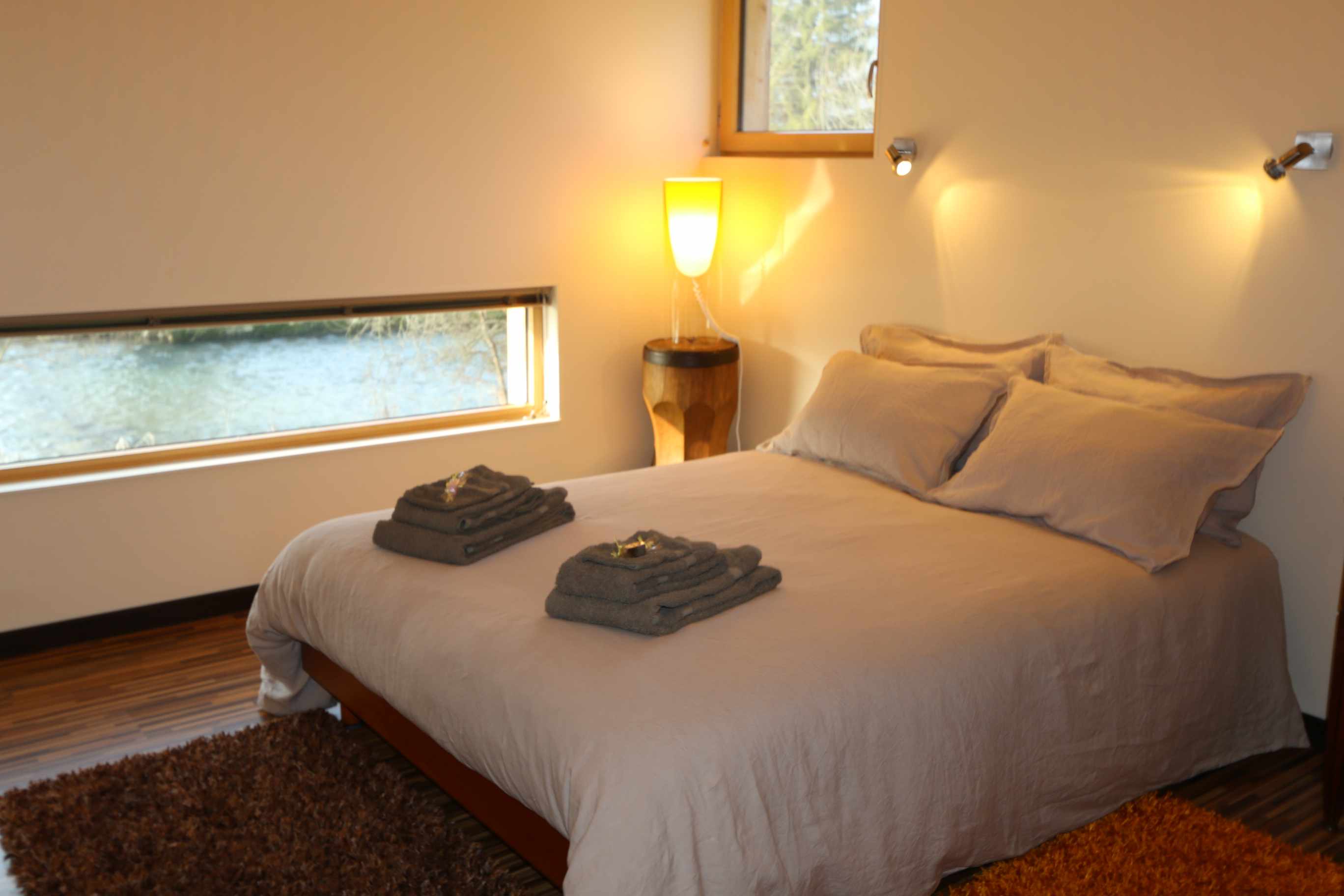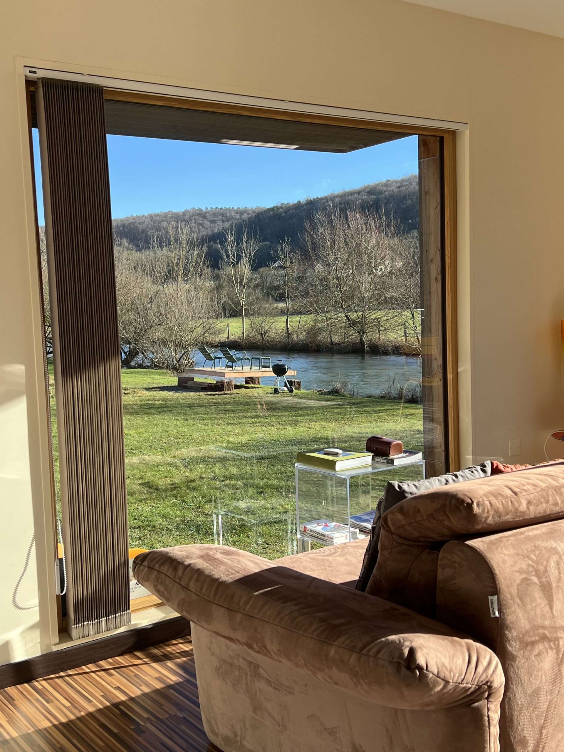 Hébergement insolite en Bourgogne : un cylindre en bois avec vue sur la rivière.