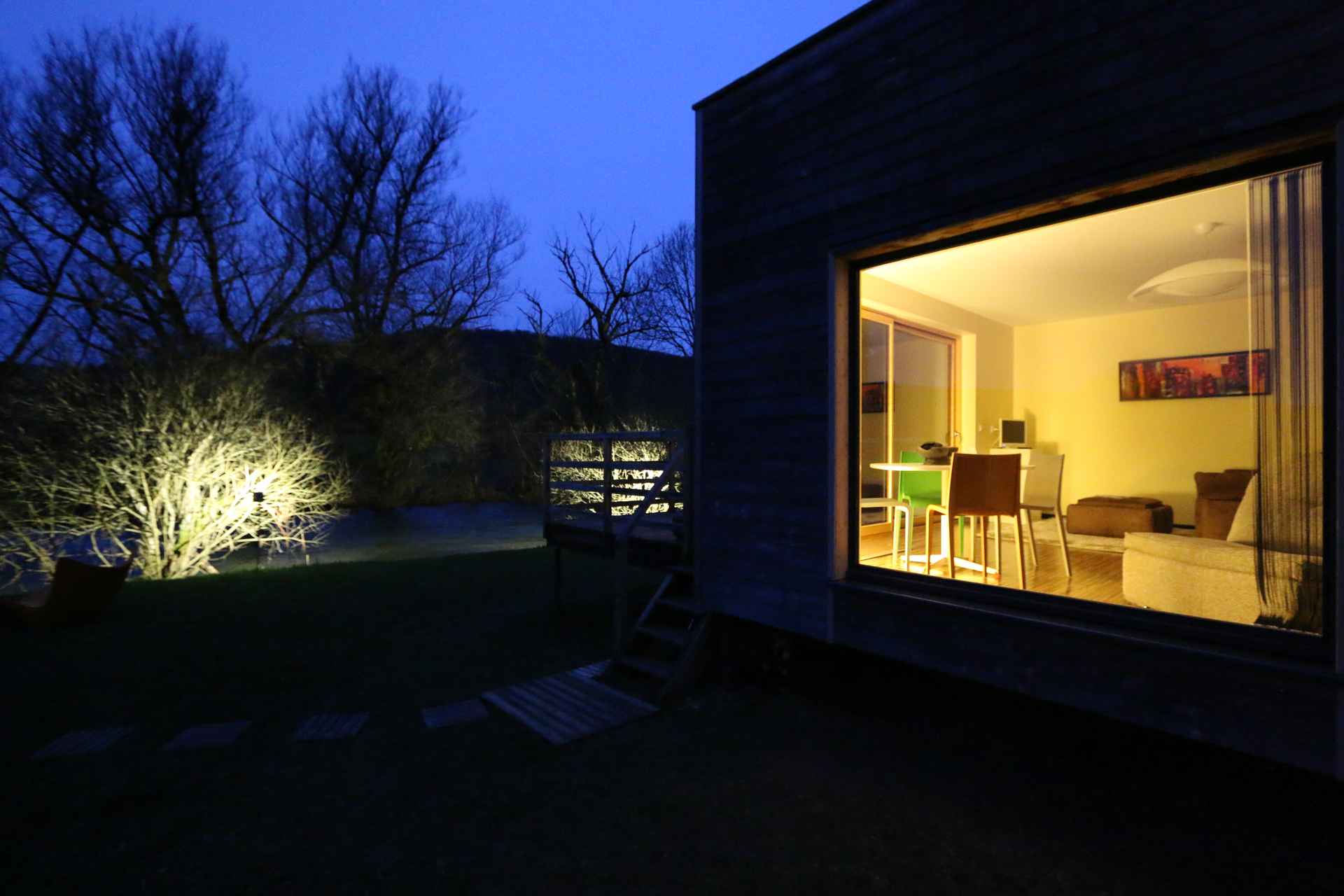 Cabane en bois à Bourgogne, avec terrasse éclairée et vue sur la nature.