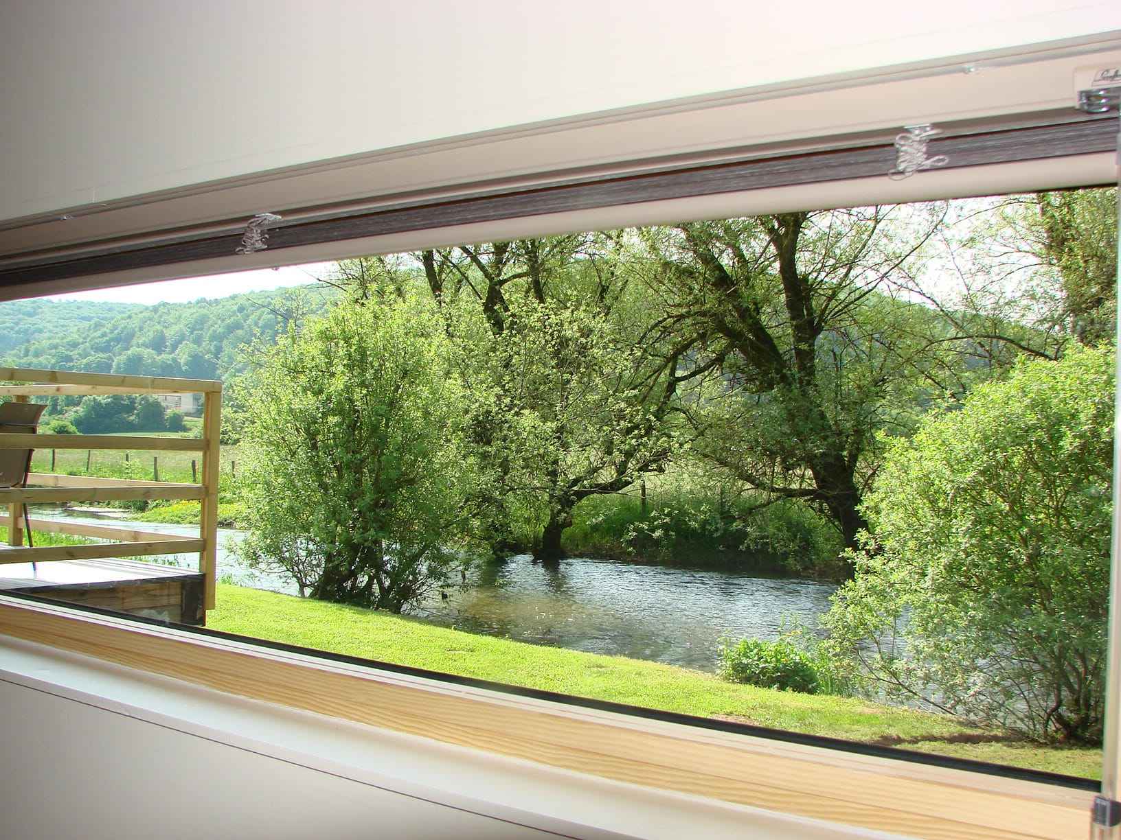Cabane en bois au bord dune rivière, entourée de verdure luxuriante en Bourgogne.