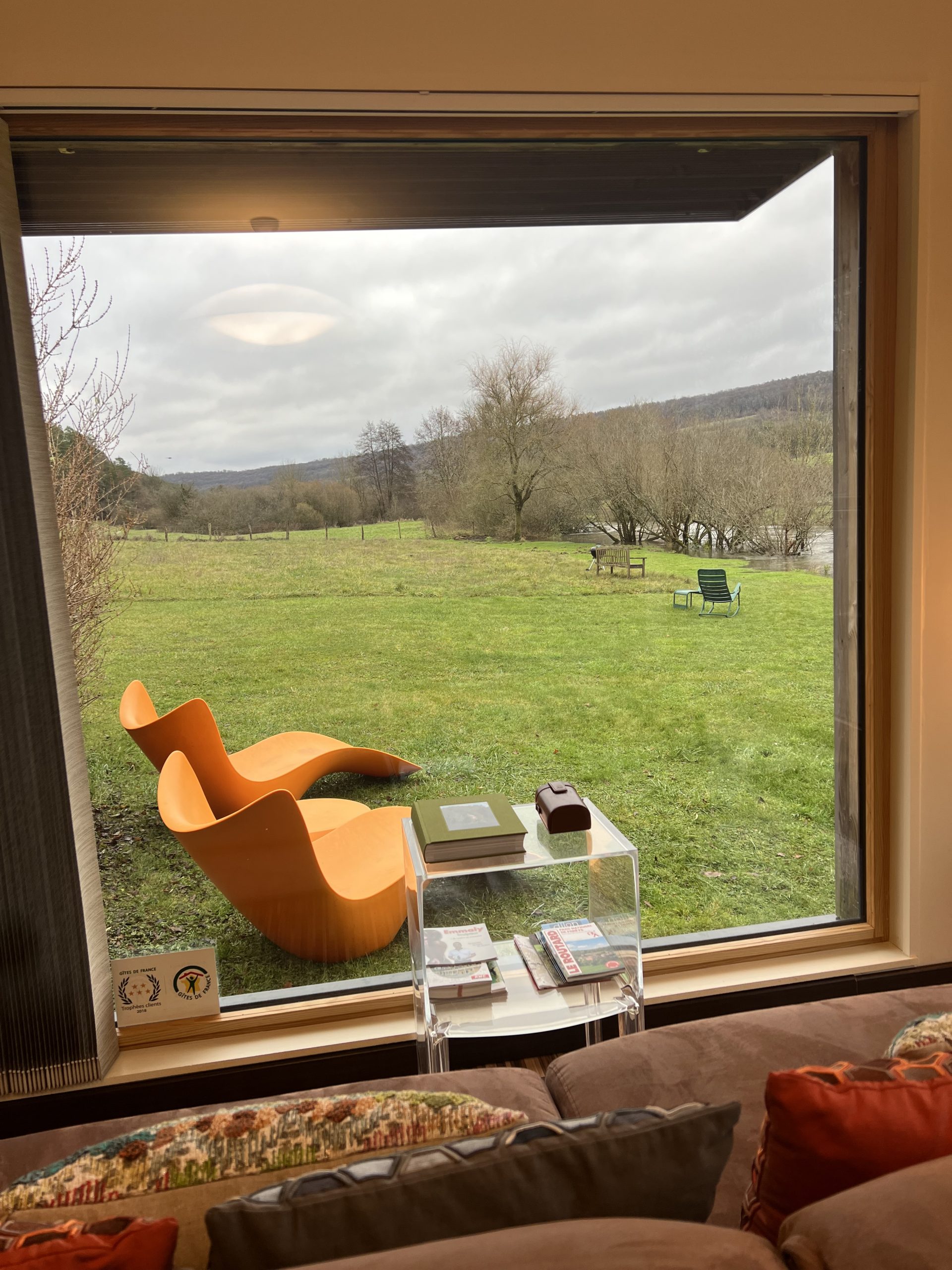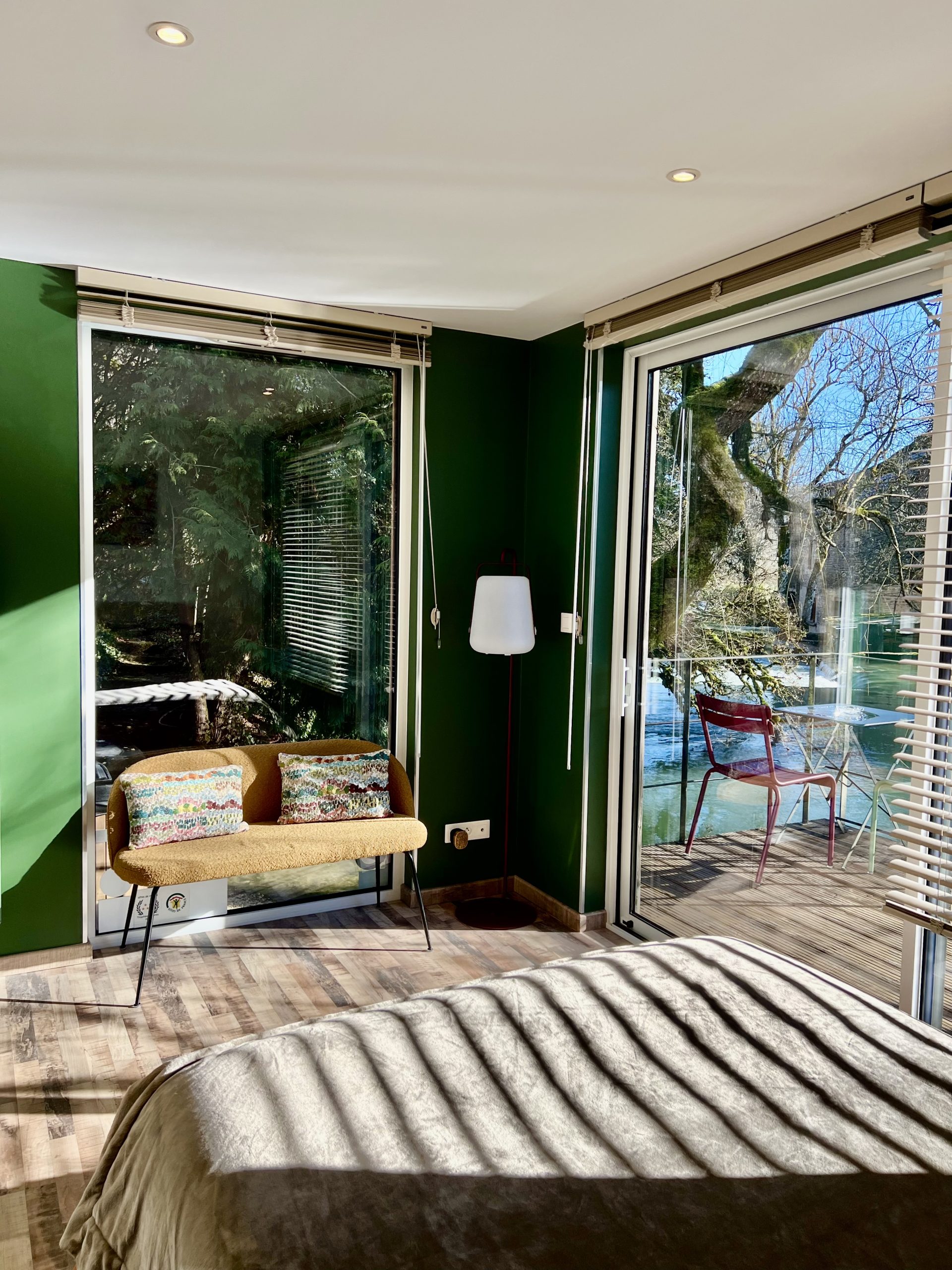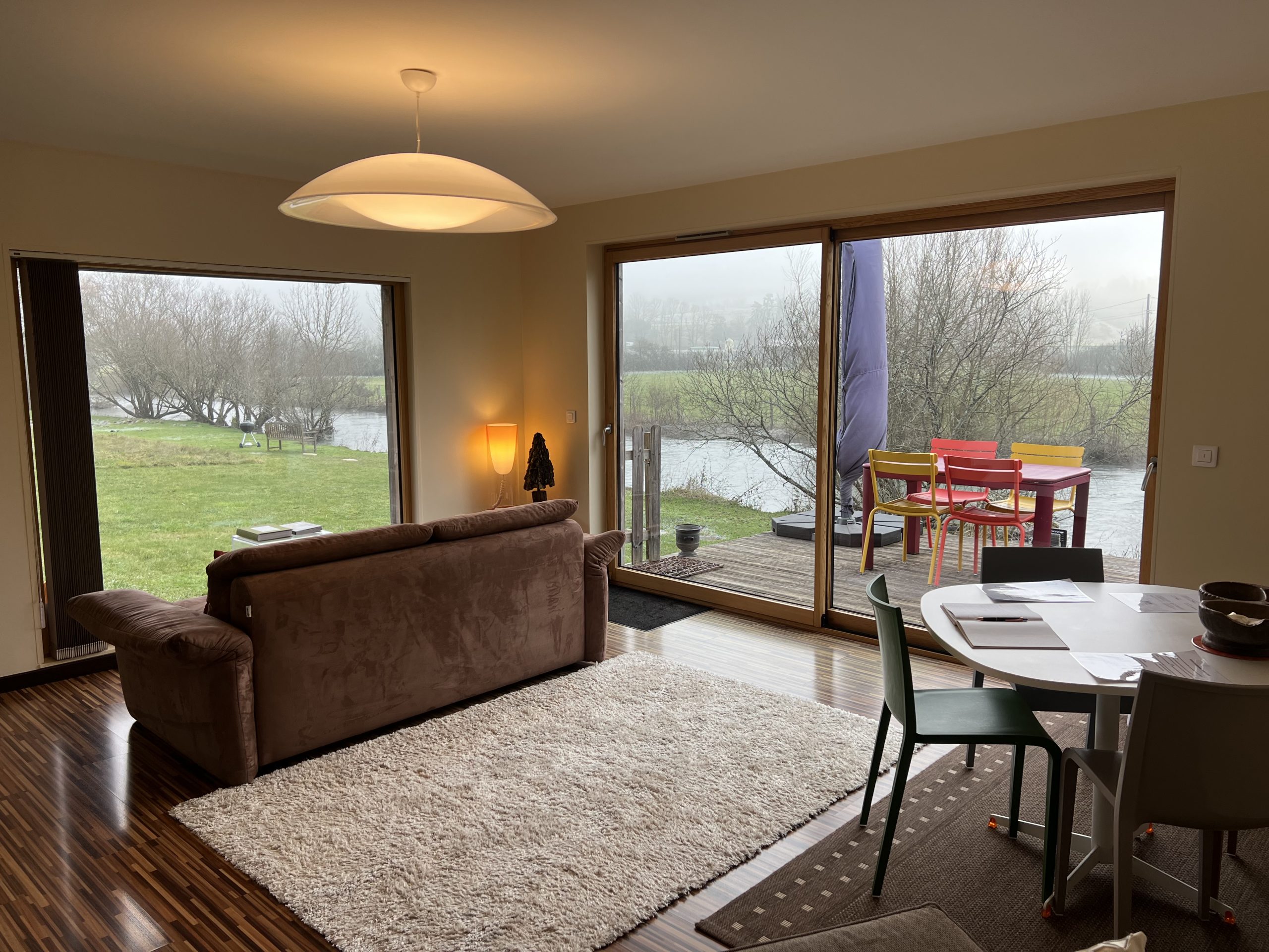 Hébergement insolite en Bourgogne : terrasse en bois avec chaises, vue sur la rivière.