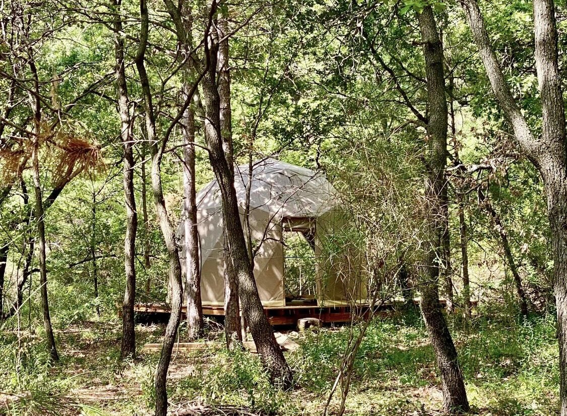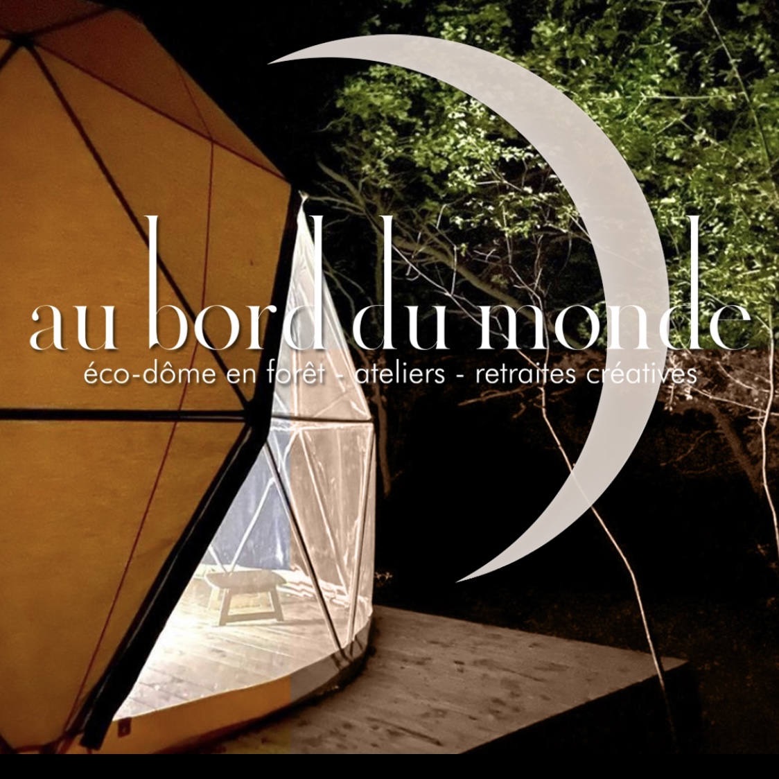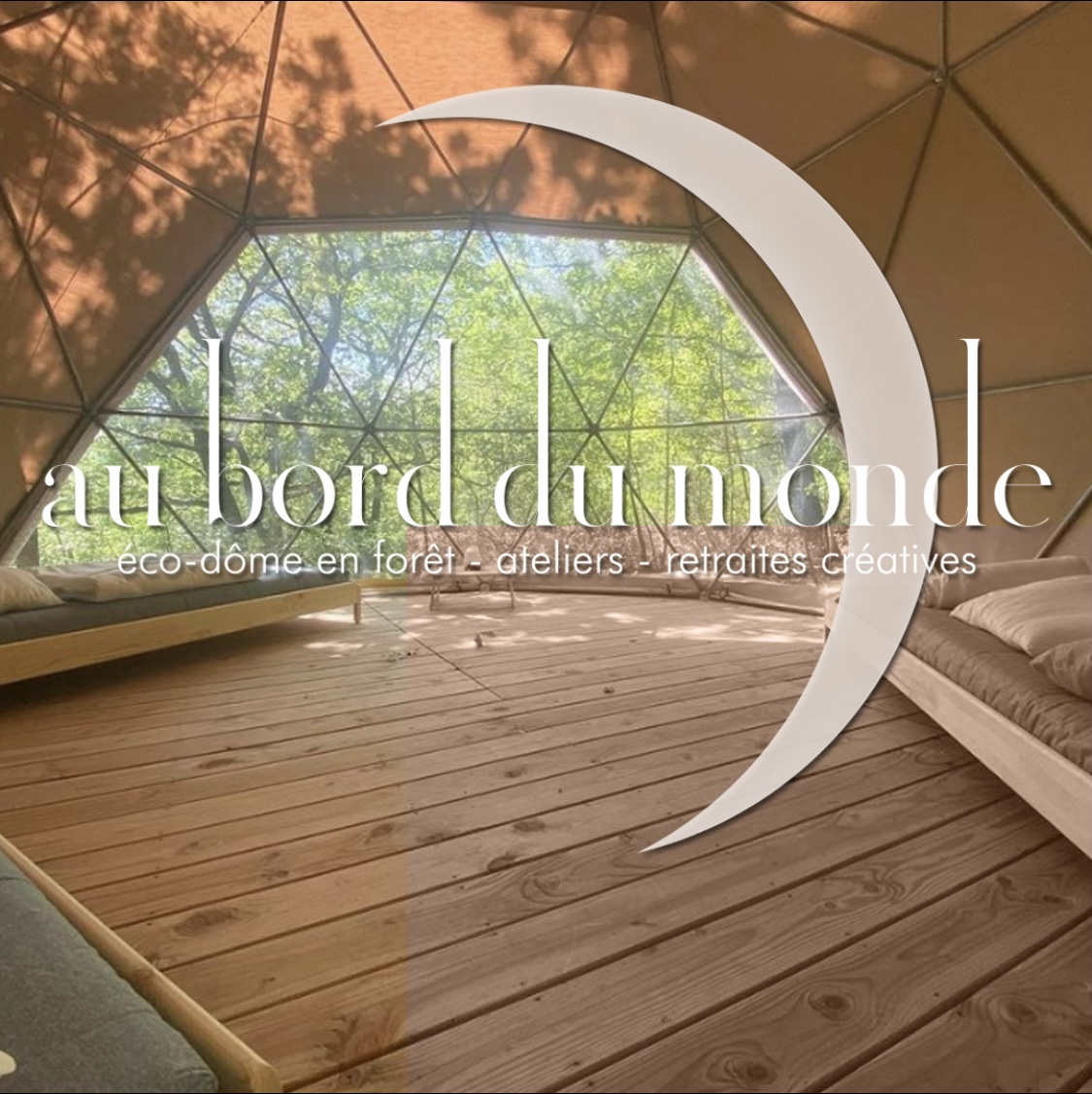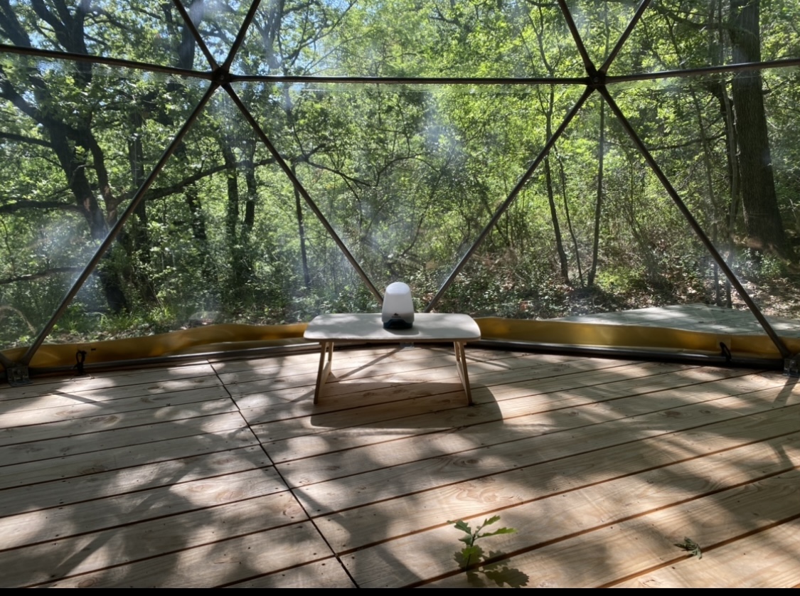 Dôme géodésique en pleine nature, entouré darbres, avec terrasse en bois.
