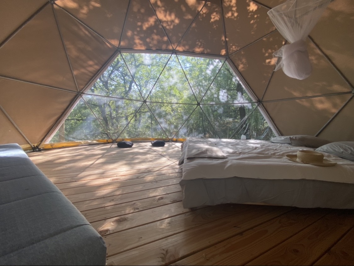 Dôme géodésique en bois, intérieur lumineux avec lits confortables et vue sur la nature.