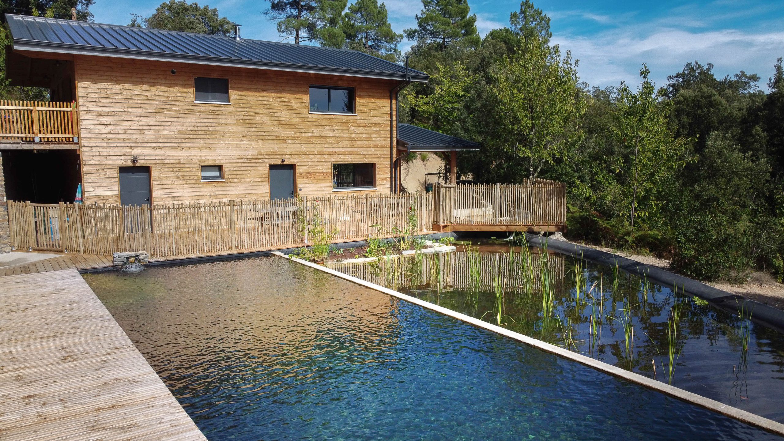 Chalet moderne avec vue sur un étang, entouré de verdure apaisante.
